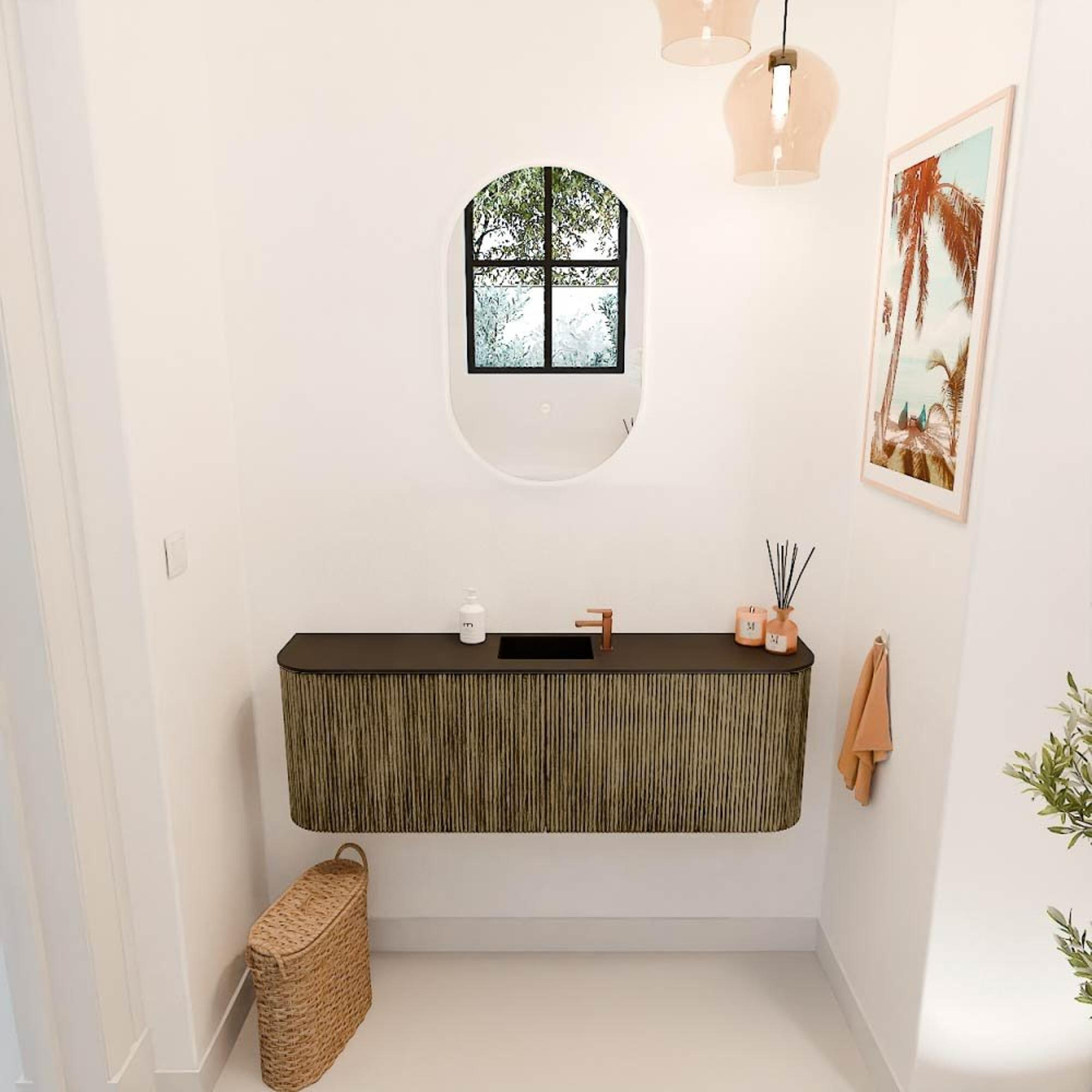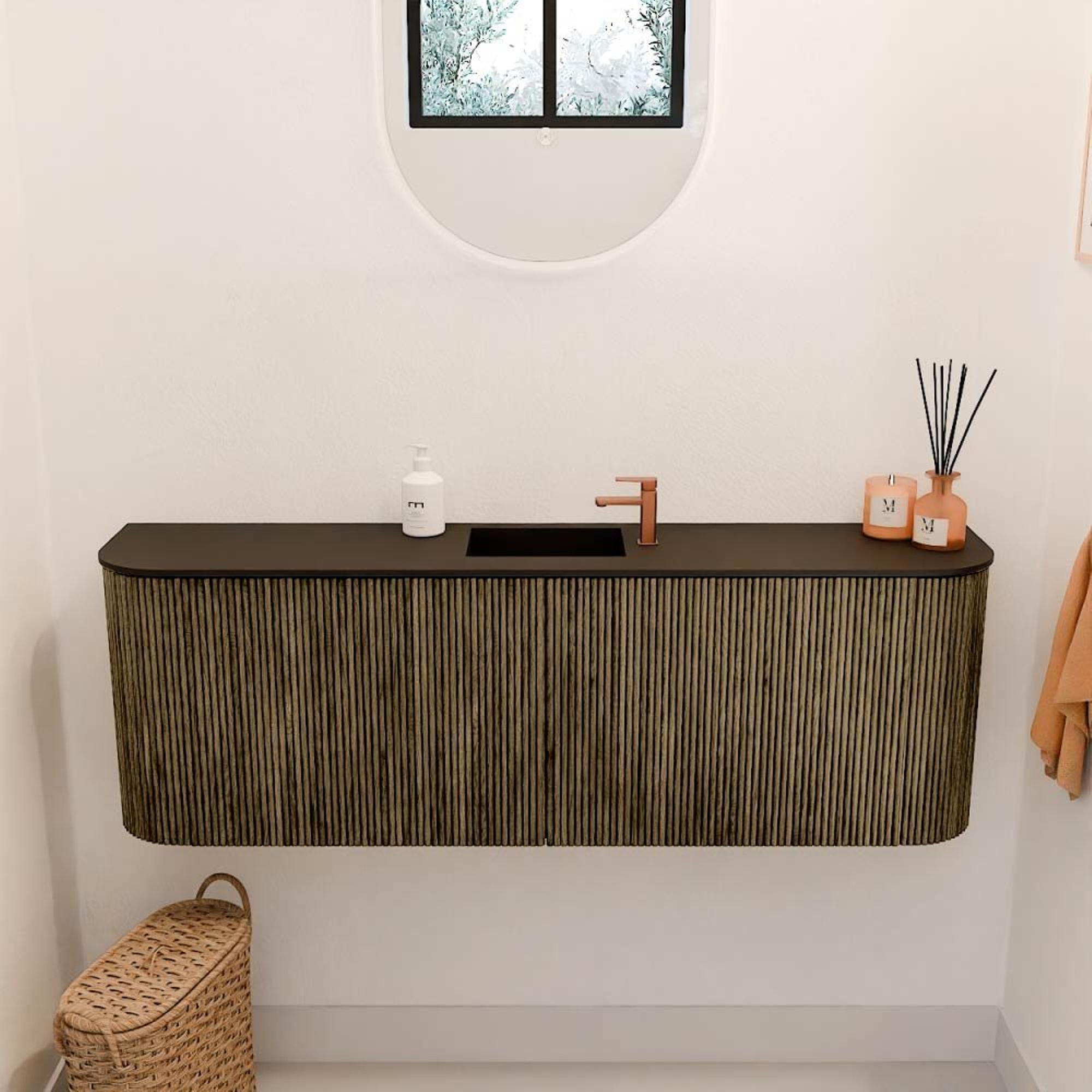 De uitstraling van dit meubel is tijdloos en elegant. De massief eikenhouten fronten met een warme Dusk-kleur geven jouw badkamer een natuurlijke en luxe sfeer. De subtiele rondingen aan de linker- en rechterkant zorgen voor een uniek design dat zich onderscheidt van standaard meubels. Door de combinatie van hout en de strakke wastafel in Urban kleur ontstaat een perfect evenwicht tussen modern en klassiek. Dit meubel is een echte blikvanger die jouw badkamer een persoonlijke touch geeft, zonder te overheersen.