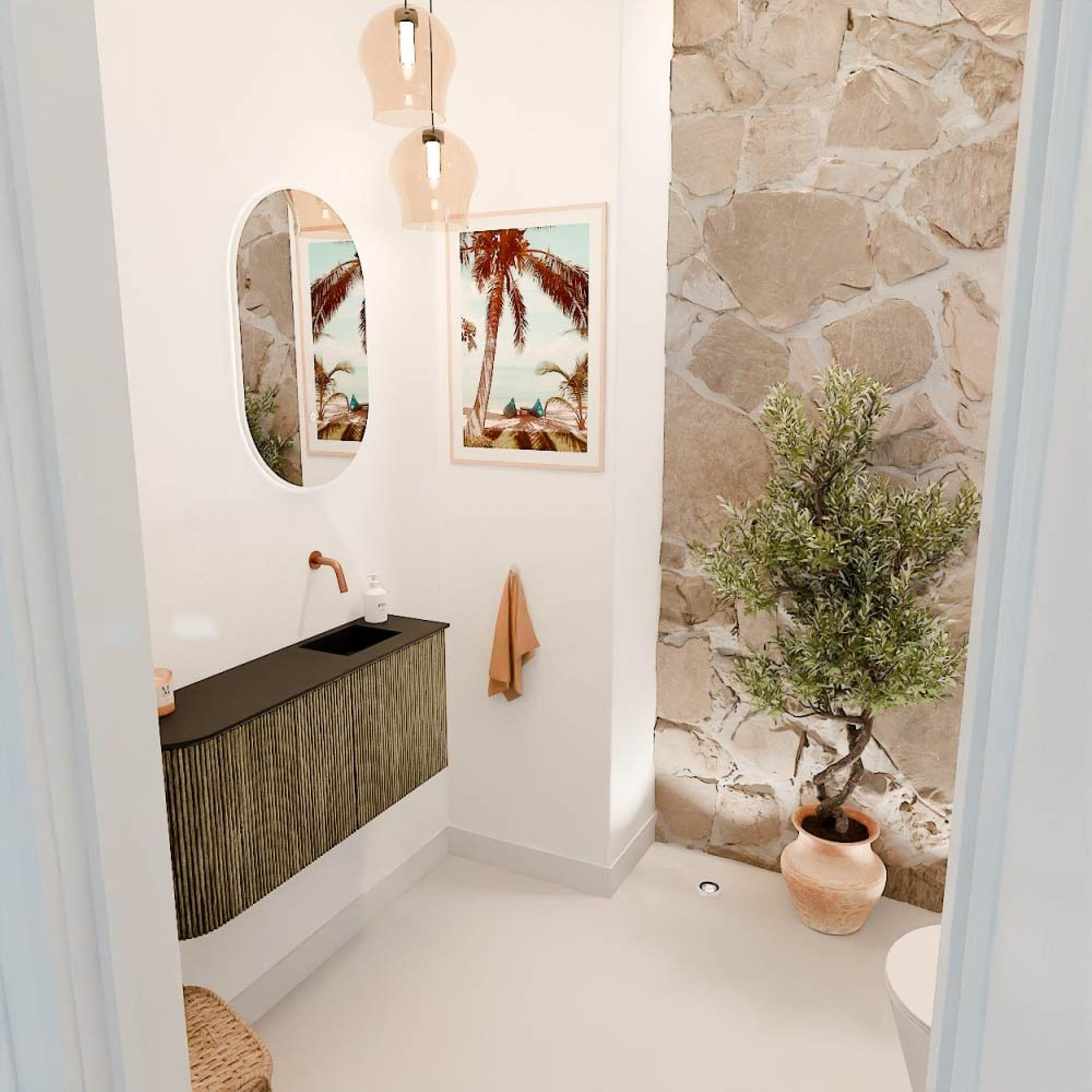 De combinatie van massief eikenhout aan de voorkant en eikenfineer aan de zijkanten geeft het meubel een luxe en natuurlijke uitstraling. Het subtiele ribbelpatroon en de afgeronde linkerzijde zorgen voor een uniek design dat moeiteloos past in zowel moderne als klassieke badkamers. Door de kleur Dusk krijgt het meubel een warme, zachte tint die rust uitstraalt en perfect aansluit bij diverse interieurstijlen. Zo creëer je een stijlvolle badkamer die indruk maakt zonder te overheersen.