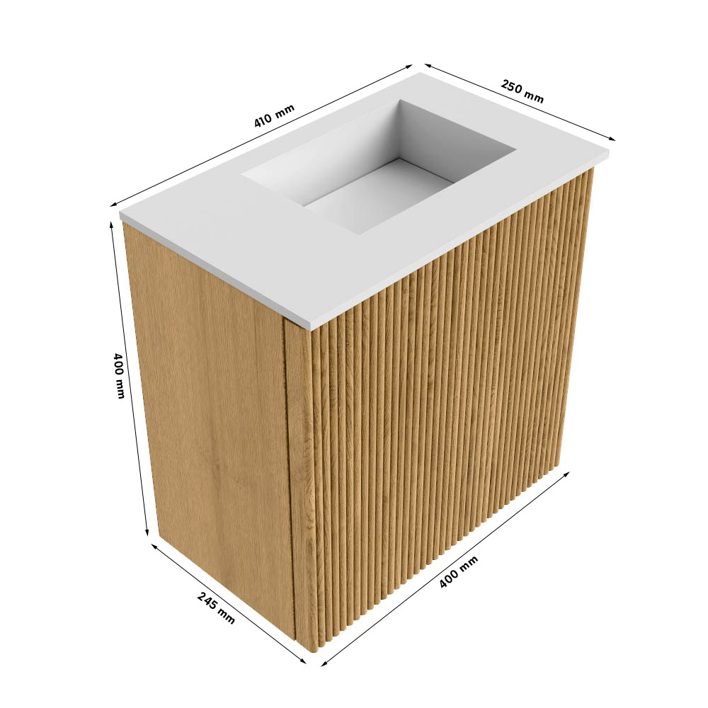 Met dit compacte en stijlvolle meubel geef je jouw badkamer of toiletruimte direct een frisse en moderne uitstraling. Het meubel combineert een warme, robuuste look dankzij het gebruik van massief eikenhout en eikenfineer met een strak design dat perfect past in kleinere ruimtes. De subtiele verticale ribbelstructuur op de voorkant zorgt voor een eigentijdse touch, terwijl de combinatie van de diepe Ruby-kleur van het meubel en de zachte talc-kleur van de wastafel een prachtig contrast creëert. Dankzij het slimme formaat van 40 cm breed en de praktische wandmontage benut je de ruimte optimaal, zonder dat het meubel te veel plek inneemt. De wastafel met rechts geplaatst kraangat maakt het geheel compleet en biedt je alle gemak tijdens het gebruik. Zo transformeer je jouw badkamer in een plek waar stijl en functionaliteit hand in hand gaan, en waar je elke dag met plezier begint.