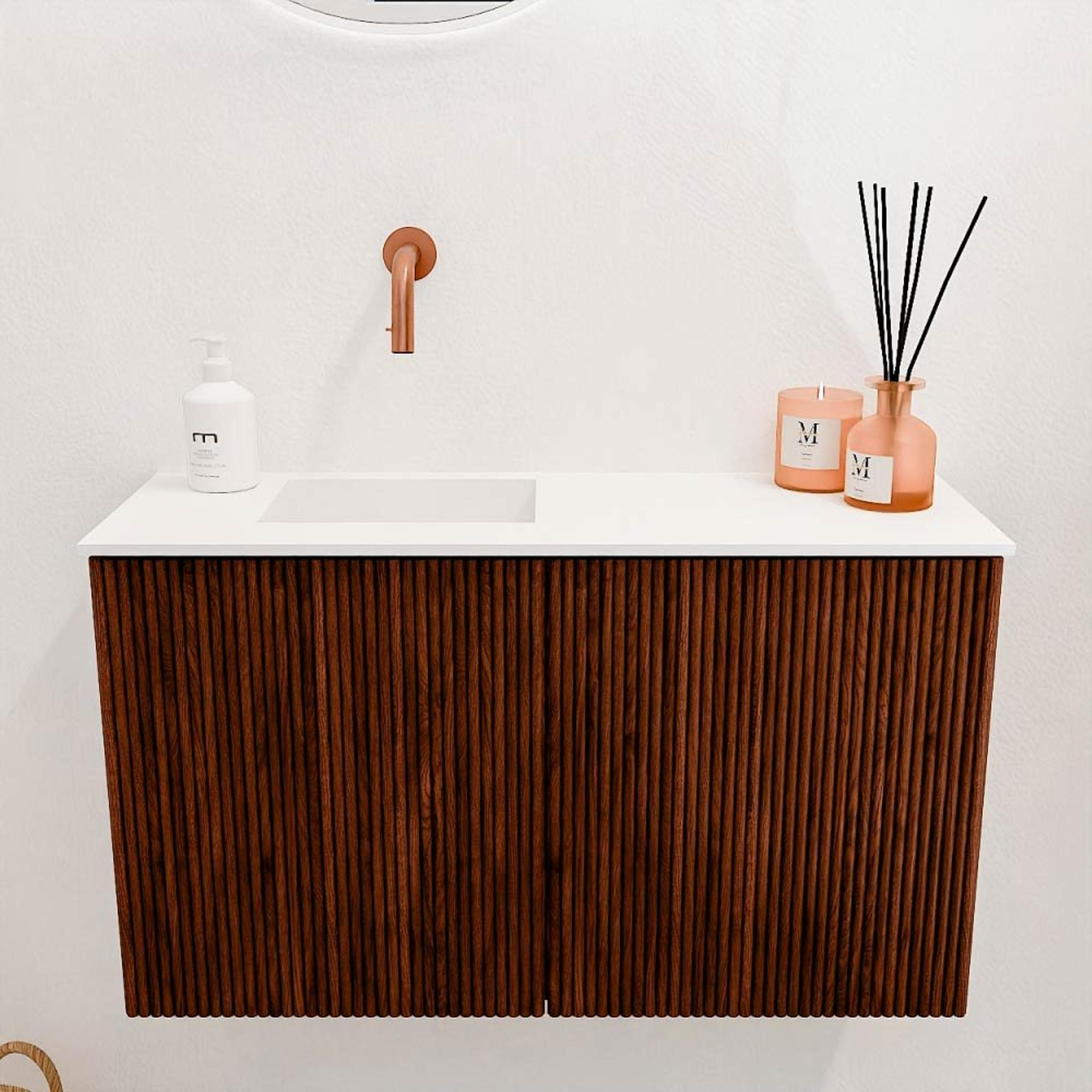 De opvallende Ruby-kleur geeft het meubel een unieke en warme uitstraling die je badkamer direct karakter geeft. In combinatie met de zachte Talc-wastafel ontstaat een harmonieus geheel dat zowel modern als tijdloos oogt. Het ribbelfront van massief eikenhout voegt een natuurlijke textuur toe, waardoor het meubel een echte eyecatcher wordt. Zo creëer je een badkamer die niet alleen functioneel is, maar ook uitnodigt tot ontspanning en genieten.