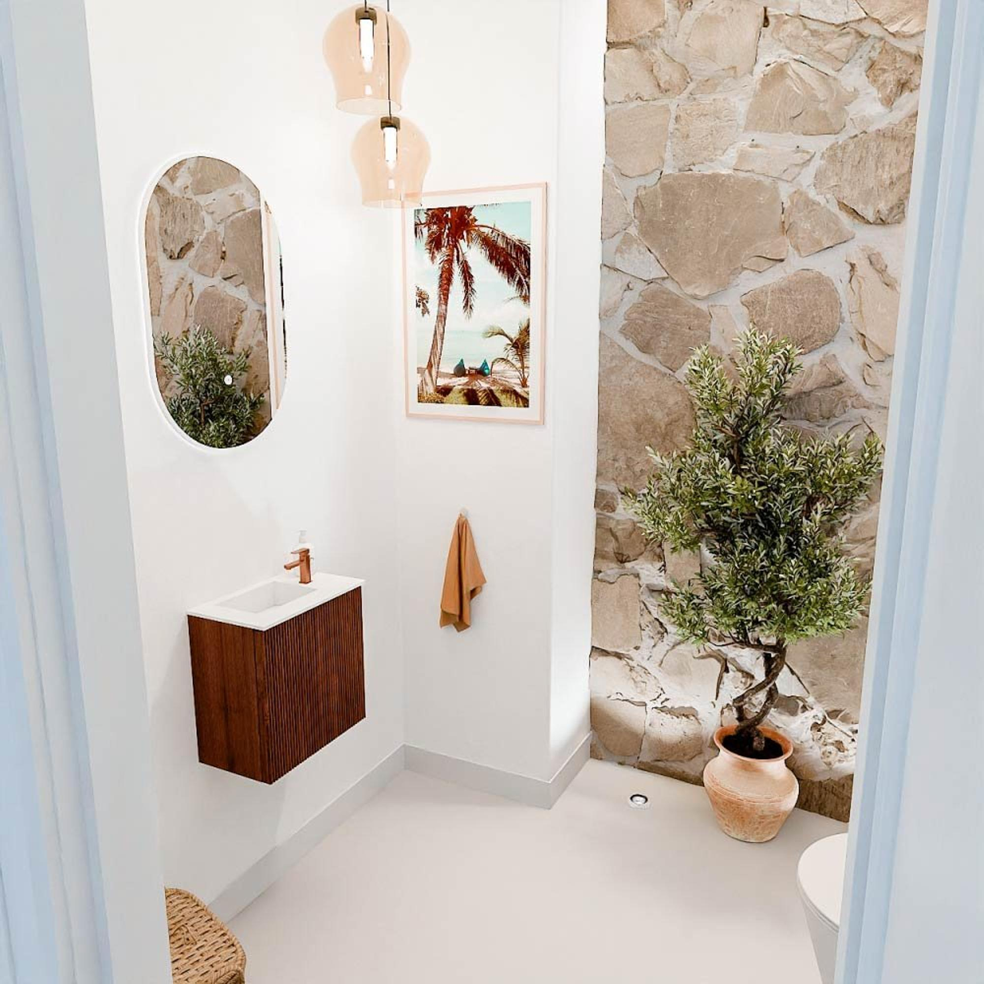 Met dit compacte meubel geef je jouw kleine badkamer of gastentoilet een stijlvolle en praktische upgrade. De combinatie van het warme Ruby-kleurige meubel met de subtiele Talc-wastafel zorgt voor een frisse, moderne uitstraling die direct sfeer toevoegt. Dankzij het slimme formaat van 40 cm breed past het meubel moeiteloos in kleinere ruimtes, zonder dat je inlevert op comfort of functionaliteit. De wastafel met links gepositioneerd kraangat maakt het gebruik extra gemakkelijk en sluit perfect aan bij jouw persoonlijke wensen. Dit meubel verandert jouw badkamer in een plek waar je elke dag met plezier begint en eindigt.