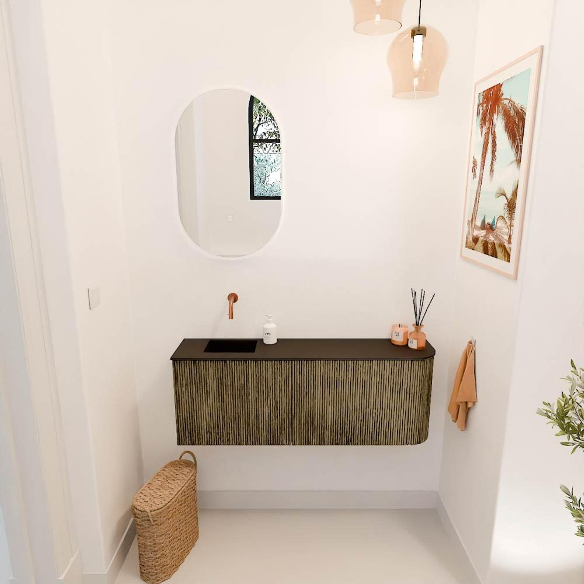Transformeer jouw badkamer met dit prachtige meubel dat niet alleen functioneel is, maar ook een echte blikvanger vormt. De subtiele ronding aan de rechterkant geeft het meubel een unieke uitstraling, terwijl de combinatie van de diepe kleur Dusk en de Urban wastafel een moderne en sfeervolle ambiance creëert. Dankzij het slimme ontwerp met de wastafel aan de linkerkant benut je de ruimte optimaal, wat zorgt voor een rustgevende en georganiseerde badkamer. Dit meubel voegt direct warmte en karakter toe, waardoor jouw badkamer verandert in een plek waar je elke dag met plezier begint en eindigt.