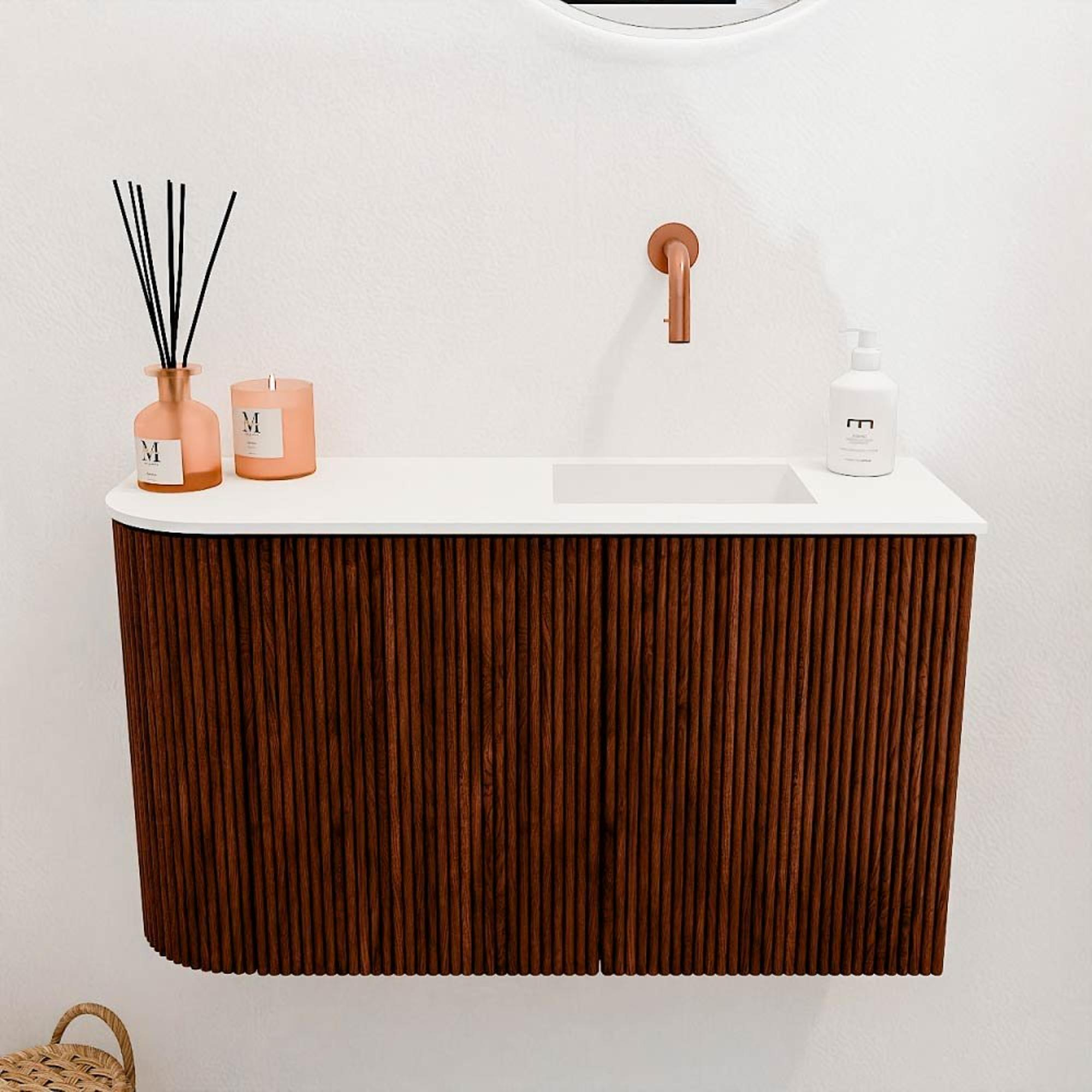 De warme Ruby kleur van het meubel in combinatie met het natuurlijke eikenhout zorgt voor een tijdloze en elegante uitstraling. Dit meubel is een echte eyecatcher die jouw badkamer direct een luxe upgrade geeft. Door het gebruik van hoogwaardige materialen straalt het meubel kwaliteit en vakmanschap uit. De subtiele ronding aan de linkerkant voegt een uniek detail toe dat het ontwerp onderscheidt van standaard badkamermeubels. Zo geniet je niet alleen van een functioneel meubel, maar ook van een stijlvol element dat perfect past bij diverse interieurstijlen.