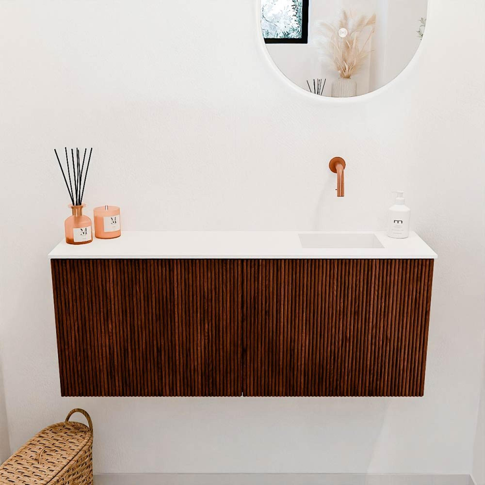 Met zijn verticale ribbelstructuur en de diepe, rijke kleur Ruby springt dit meubel direct in het oog. De combinatie van massief eikenhout aan de voorkant en eikenfineer aan de zijkanten geeft het een natuurlijke en exclusieve uitstraling. Dit zorgt ervoor dat jouw badkamer niet alleen functioneel is, maar ook een warme en uitnodigende sfeer uitstraalt. De wastafel in de subtiele kleur Talc voegt een zachte, lichte toets toe die perfect contrasteert met het meubel. Zo creëer je een harmonieus geheel dat zowel modern als tijdloos oogt.