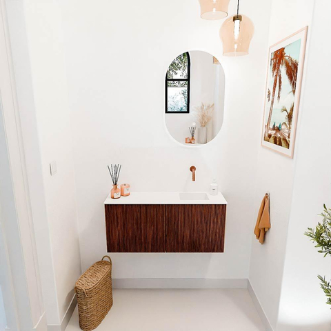 Het meubel valt direct op door zijn rijke Ruby kleur, die warmte en luxe uitstraalt. De strakke lijnen en het subtiele ribbelpatroon op de fronten zorgen voor een eigentijdse en verfijnde uitstraling. De combinatie met de Talc wastafel, die een zachte, natuurlijke tint heeft, maakt het geheel bijzonder aantrekkelijk. Dit meubel is een echte blikvanger die jouw badkamer een unieke en persoonlijke touch geeft. Door het minimalistische design past het moeiteloos in diverse interieurstijlen, van modern tot klassiek. Zo creëer je een badkamer die niet alleen functioneel is, maar ook een plek waar je graag tijd doorbrengt.