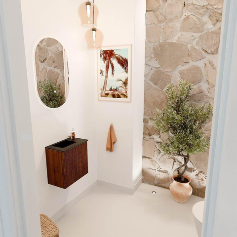Met dit compacte en stijlvolle meubel geef je jouw badkamer direct een warme en natuurlijke uitstraling. Het combineert de robuuste charme van massief eikenhout met een moderne afwerking in een prachtige Ruby kleur. Dankzij het slimme formaat van 40 cm breed en 40 cm hoog past het perfect in kleinere ruimtes, zonder in te leveren op functionaliteit. De bijgeleverde wastafel, uitgevoerd in het hoogwaardige Solid Surface materiaal, heeft een subtiele, matte Urban kleur en een kraangat aan de linkerkant, wat zorgt voor een praktische en eigentijdse look. Dit meubel is ideaal voor wie houdt van een natuurlijke sfeer, maar ook waarde hecht aan gemak en duurzaamheid. Door de wandmontage oogt de ruimte bovendien ruimtelijker en blijft de vloer makkelijk schoon te houden. Zo geniet je elke dag van een frisse, opgeruimde badkamer die uitnodigt tot ontspannen momenten.