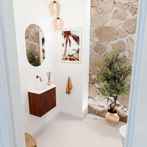 Transformeer jouw toiletruimte met dit prachtige meubel dat stijl en functionaliteit moeiteloos combineert. Dankzij het doordachte ontwerp en de verfijnde afwerking krijgt jouw badkamer direct een moderne en warme uitstraling. Dit meubel is niet zomaar een opbergplek; het is een stijlvolle blikvanger die jouw dagelijkse routine aangenamer maakt. De subtiele ronding aan de rechterkant zorgt voor een speels detail, terwijl de combinatie van rijke kleuren en natuurlijke materialen een uitnodigende sfeer creëert. Met een wastafel die links gepositioneerd is en zonder kraangat, biedt het meubel volop ruimte om jouw eigen kraan te kiezen en te plaatsen. Zo geniet je van maximale vrijheid in stijl en gebruiksgemak. Of je nu een compacte ruimte hebt of juist een plek zoekt die nét dat beetje extra klasse toevoegt, dit meubel past perfect in jouw badkamer.