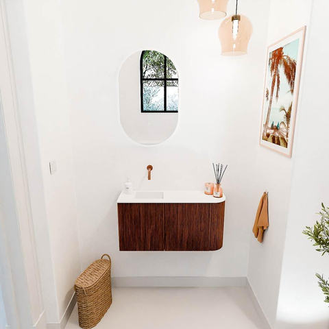 Transformeer je badkamer met een meubel dat niet alleen praktisch is, maar ook een echte blikvanger vormt. Dit stijlvolle meubel combineert een warme, robuuste uitstraling met een verfijnde afwerking die direct sfeer toevoegt aan je ruimte. Dankzij het doordachte ontwerp met een subtiele ronding aan de rechterkant en een wastafel aan de linkerkant, benut je elke centimeter optimaal. De combinatie van de diepe, rijke Ruby-kleur en het zachte Talc van de wastafel zorgt voor een harmonieus geheel dat zowel modern als tijdloos oogt. Zonder kraangat biedt dit meubel je de vrijheid om zelf de kraan te kiezen die het beste bij jouw stijl en wensen past. Zo creëer je een badkamer die helemaal op maat is, met een meubel dat niet alleen functioneel is, maar ook een gevoel van luxe en comfort brengt.