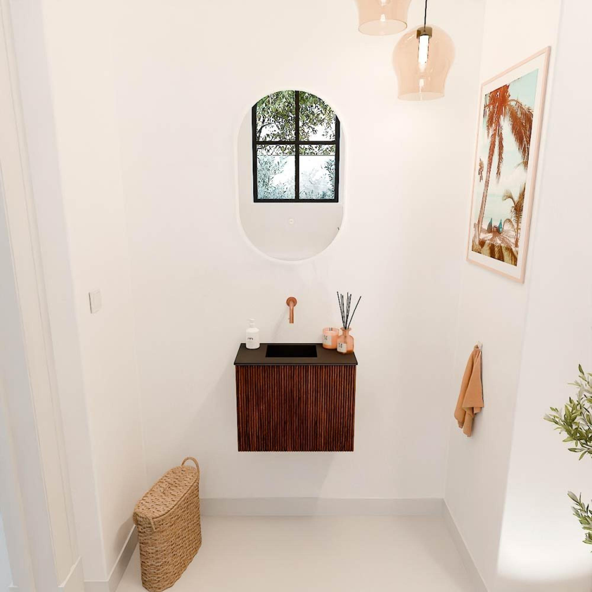 De warme ruby kleur in combinatie met het massief eikenhout maakt dit meubel tot een echte eyecatcher. Het subtiele ribbelpatroon op de fronten voegt een speels maar verfijnd detail toe, waardoor het meubel zowel modern als natuurlijk oogt. Deze stijlvolle uitstraling zorgt ervoor dat jouw badkamer of toilet een persoonlijke en uitnodigende sfeer krijgt. Bovendien past het meubel dankzij zijn compacte formaat perfect in kleinere ruimtes, zonder dat het druk of rommelig wordt.