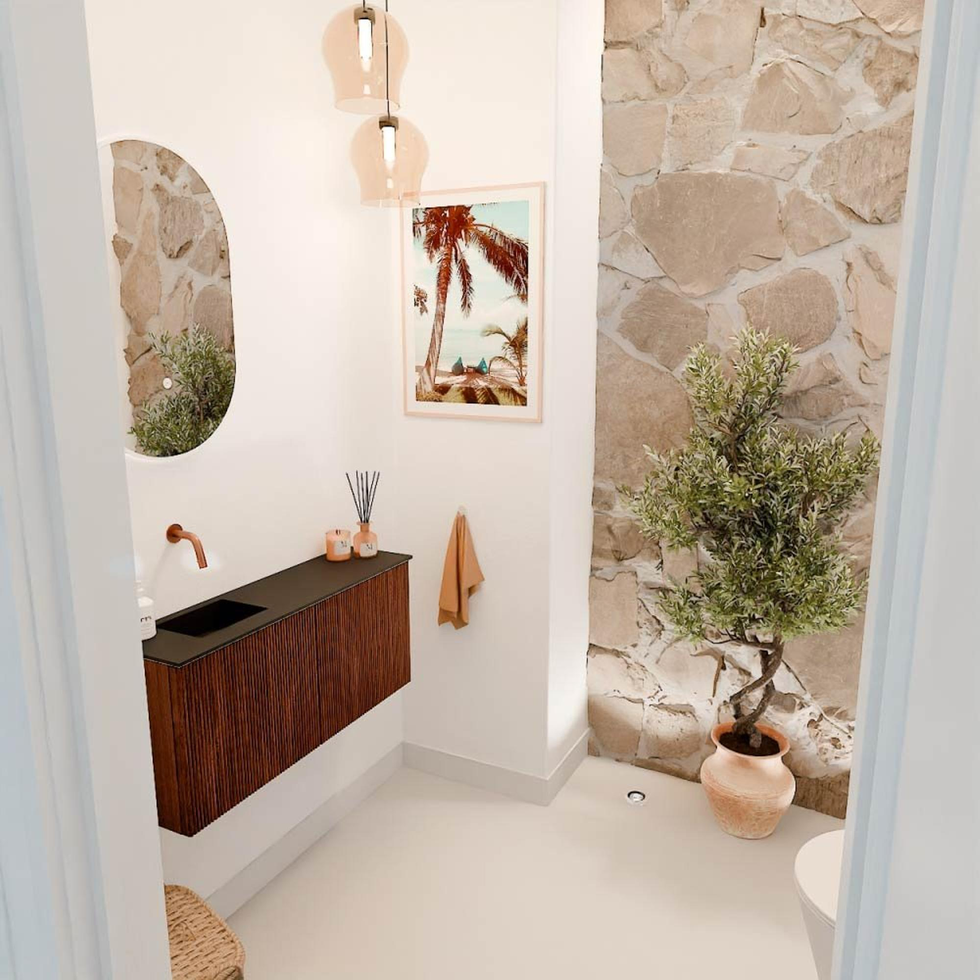 Het meubel valt direct op door het elegante ribbelfront in de warme kleur Ruby, dat een natuurlijke en tijdloze sfeer creëert. De combinatie van massief eikenhout en eikenfineer op de zijkanten geeft het geheel een luxe uitstraling die perfect past in zowel moderne als klassieke badkamers. Door de subtiele details en het hoogwaardige vakmanschap wordt jouw badkamer een plek waar stijl en comfort samenkomen. Dit meubel is een echte blikvanger die jouw interieur naar een hoger niveau tilt.