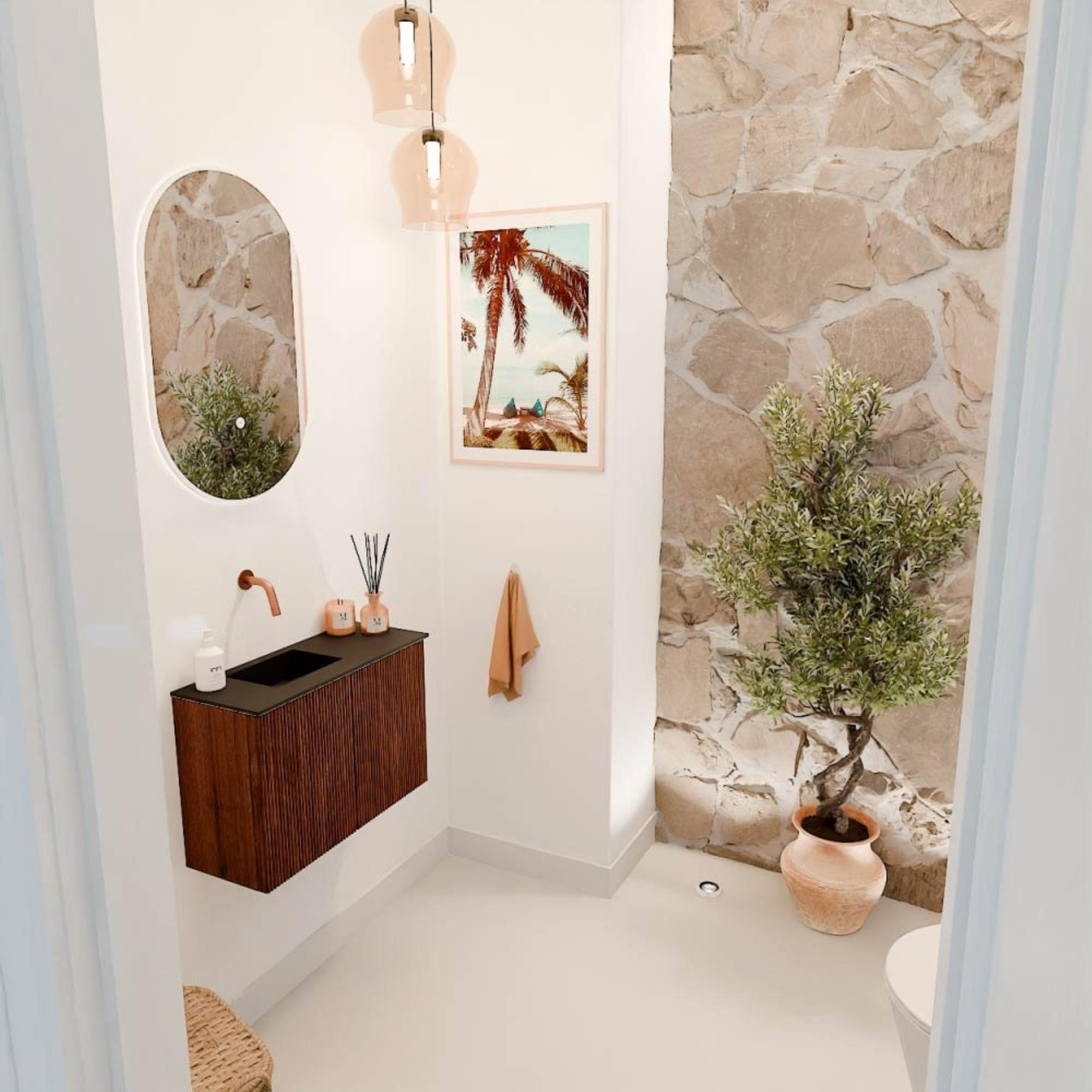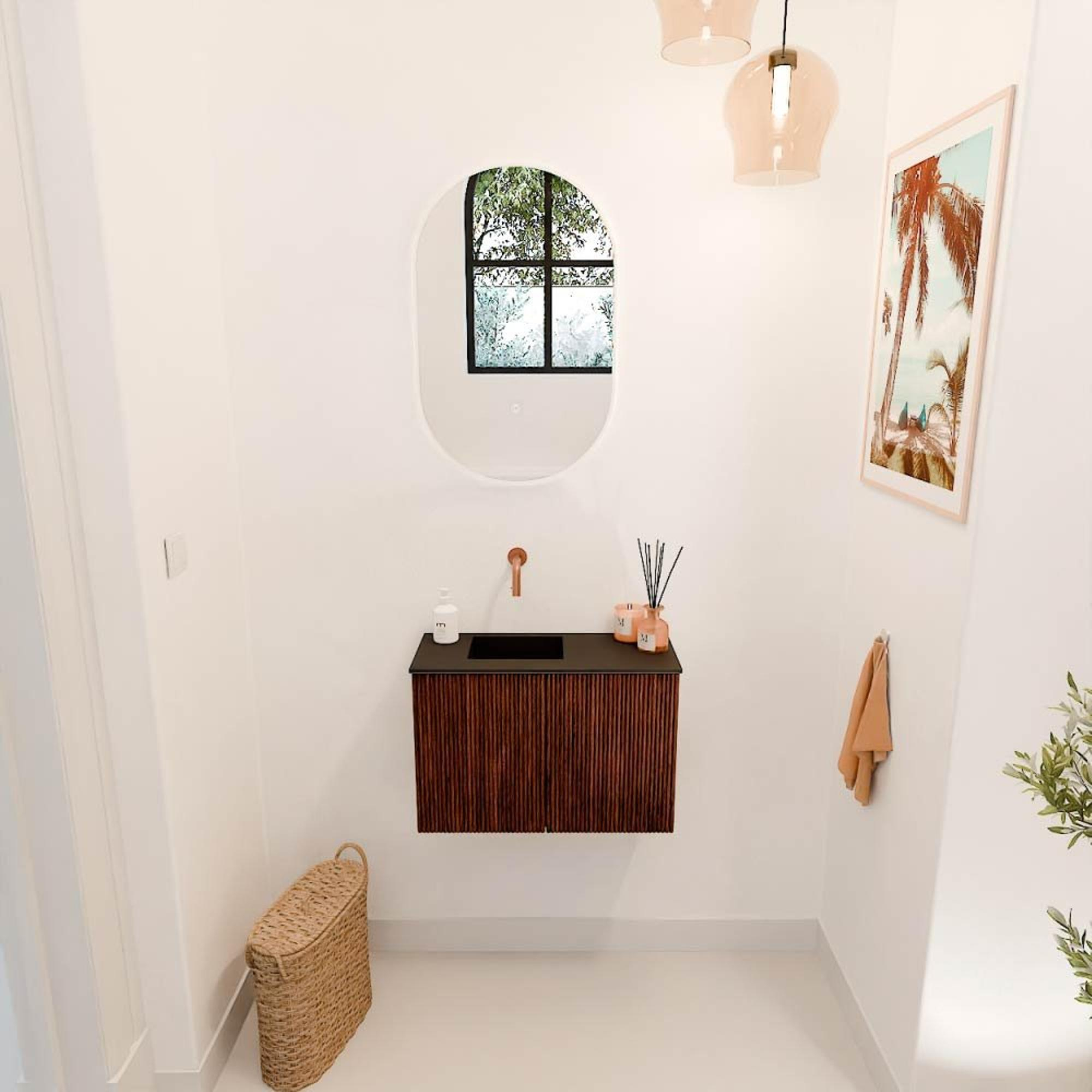 De warme Ruby kleur en de fronten van massief eikenhout geven dit meubel een natuurlijke en luxe uitstraling. Het subtiele ribbelpatroon op de voorkant voegt een uniek detail toe dat direct de aandacht trekt. Door het tijdloze design past het meubel moeiteloos in zowel moderne als klassieke badkamers. Zo creëer je een harmonieuze sfeer waarin je je elke dag weer prettig voelt. Bovendien zorgt de combinatie van kleur en materiaal voor een warme ambiance die je badkamer net dat beetje extra karakter geeft.