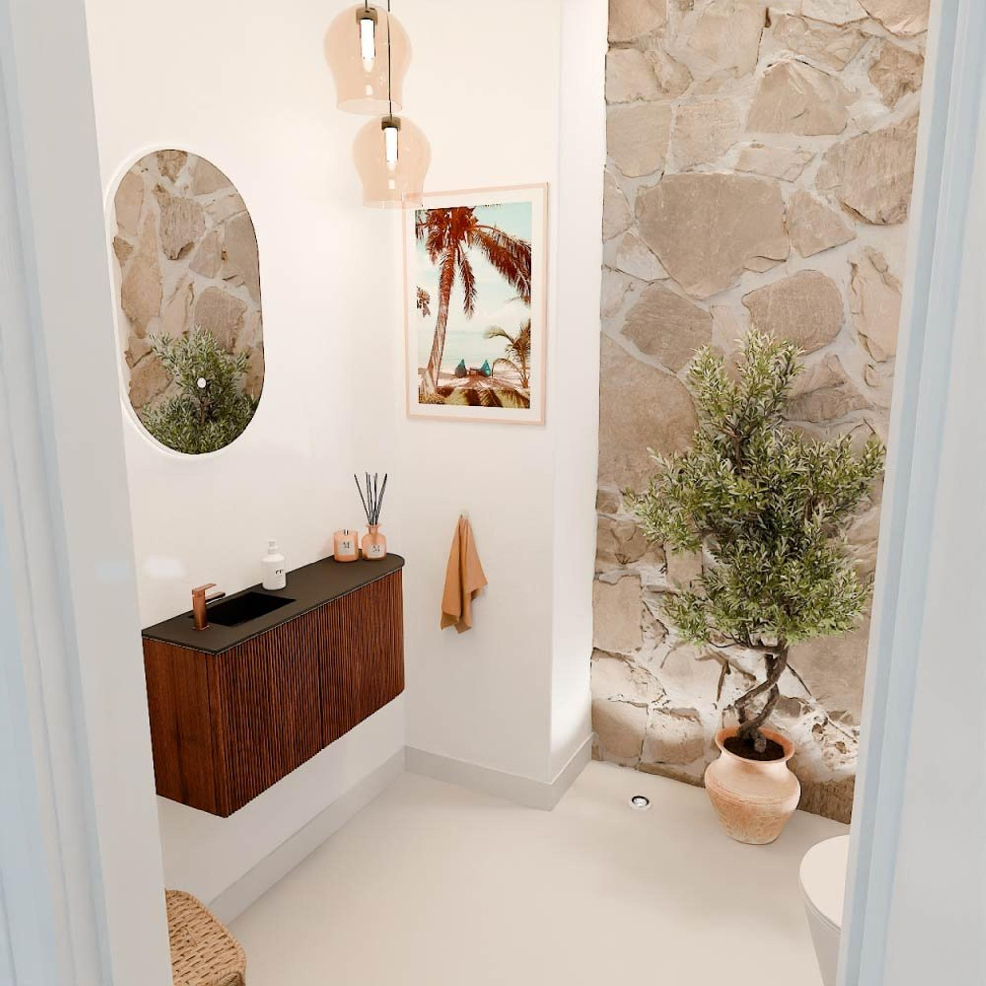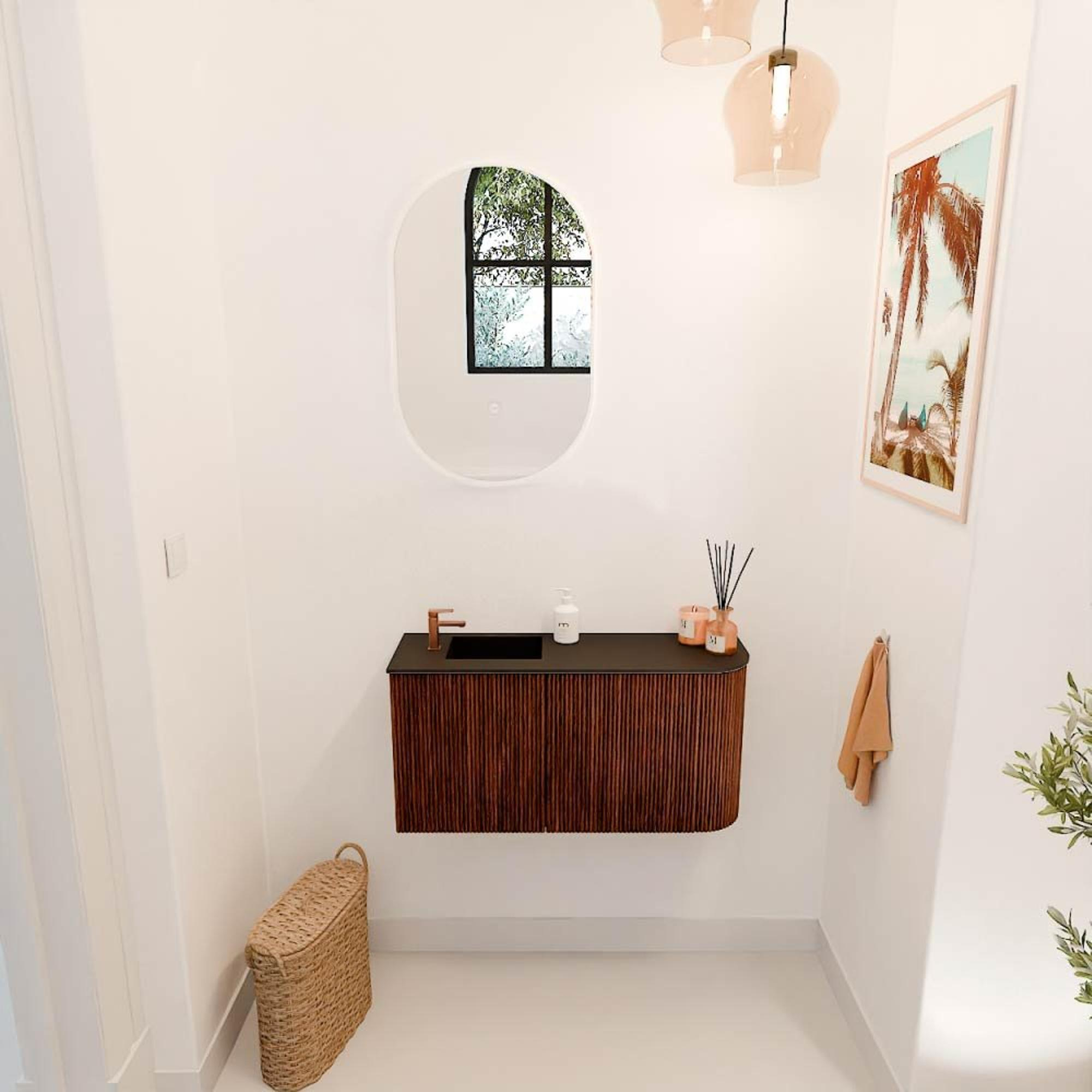Met zijn elegante ronding aan de rechterzijde en de verticale ribbelstructuur op de frontpanelen is dit meubel een echte blikvanger. De combinatie van de warme Ruby kleur met het Urban wastafelblad zorgt voor een modern en toch tijdloos design. Hierdoor past het meubel moeiteloos in uiteenlopende interieurstijlen, van klassiek tot eigentijds. Zo creëer je een badkamer die niet alleen functioneel is, maar ook een visueel statement maakt. Het subtiele detailwerk en de hoogwaardige afwerking zorgen ervoor dat je badkamer er altijd verzorgd en uitnodigend uitziet.