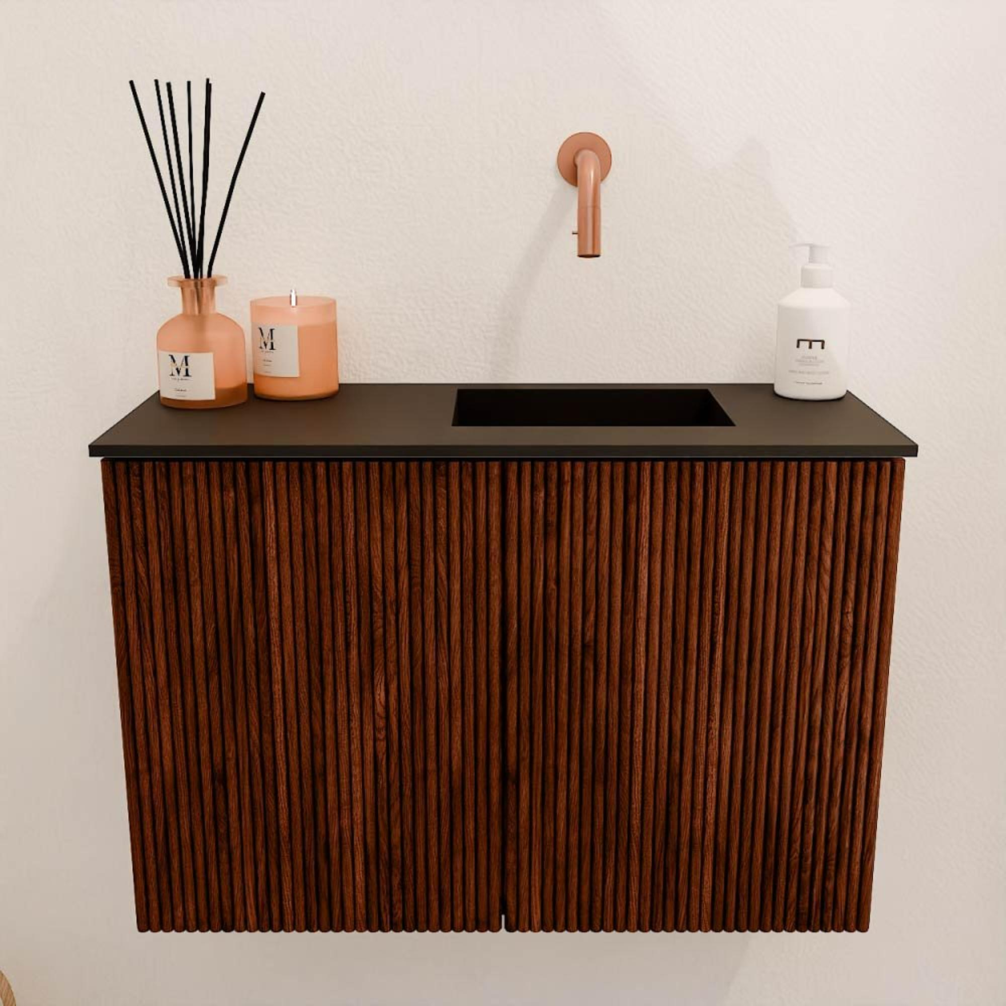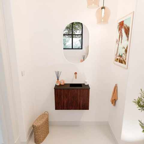 Met dit prachtige meubel geef je jouw badkamer of gastentoilet direct een stijlvolle upgrade. Het compacte ontwerp van 60 cm breed past perfect in kleinere ruimtes, zonder dat je inlevert op uitstraling of functionaliteit. De warme Ruby-kleur met subtiele Urban-tint zorgt voor een natuurlijke en uitnodigende sfeer, terwijl het gebruik van massief eikenhout en eikenfineer een hoogwaardige en duurzame indruk maakt. Dankzij de verticale ribbelstructuur op de frontpanelen krijgt het meubel een eigentijdse en elegante uitstraling die je badkamer een unieke touch geeft. De wastafel is slim gepositioneerd aan de rechterkant, zonder kraangat, zodat je zelf de kraan kunt kiezen die het beste bij jouw stijl en wensen past. Dit meubel brengt niet alleen sfeer, maar ook praktische voordelen door zijn slimme afmetingen en doordachte ontwerp. Zo geniet je elke dag van een badkamer die zowel mooi als functioneel is.