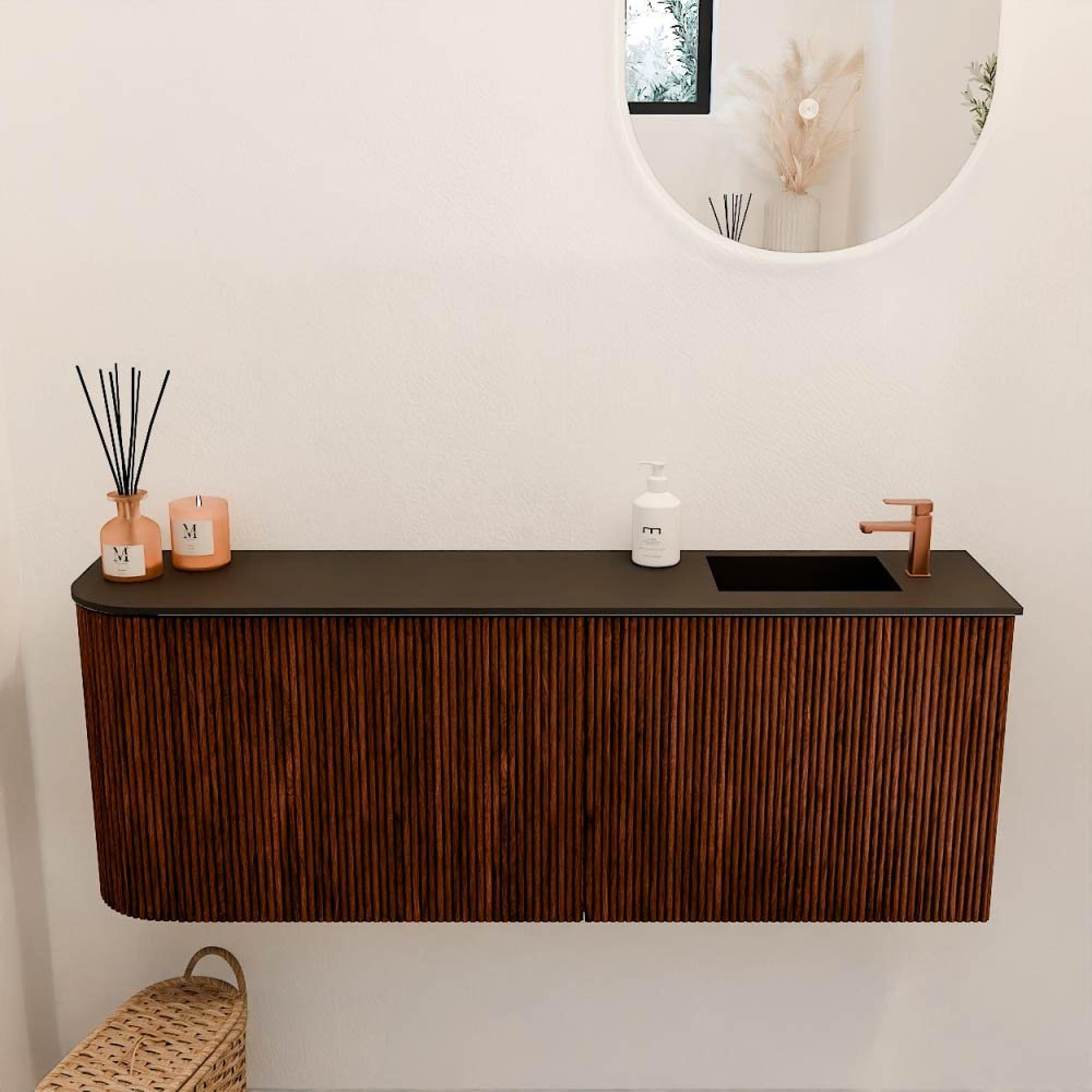 De opvallende verticale ribbelstructuur op het front geeft het meubel een eigentijdse en verfijnde uitstraling. In combinatie met de warme Ruby-kleur straalt het meubel luxe en karakter uit, waardoor het direct de sfeer van je badkamer bepaalt. Deze unieke look zorgt ervoor dat je badkamer een persoonlijke touch krijgt, zonder dat het te overheersend wordt. Door het subtiele kleurcontrast met de Urban wastafel ontstaat een harmonieus geheel dat zowel modern als tijdloos oogt. Zo geniet je elke dag van een badkamer die niet alleen functioneel is, maar ook een lust voor het oog.