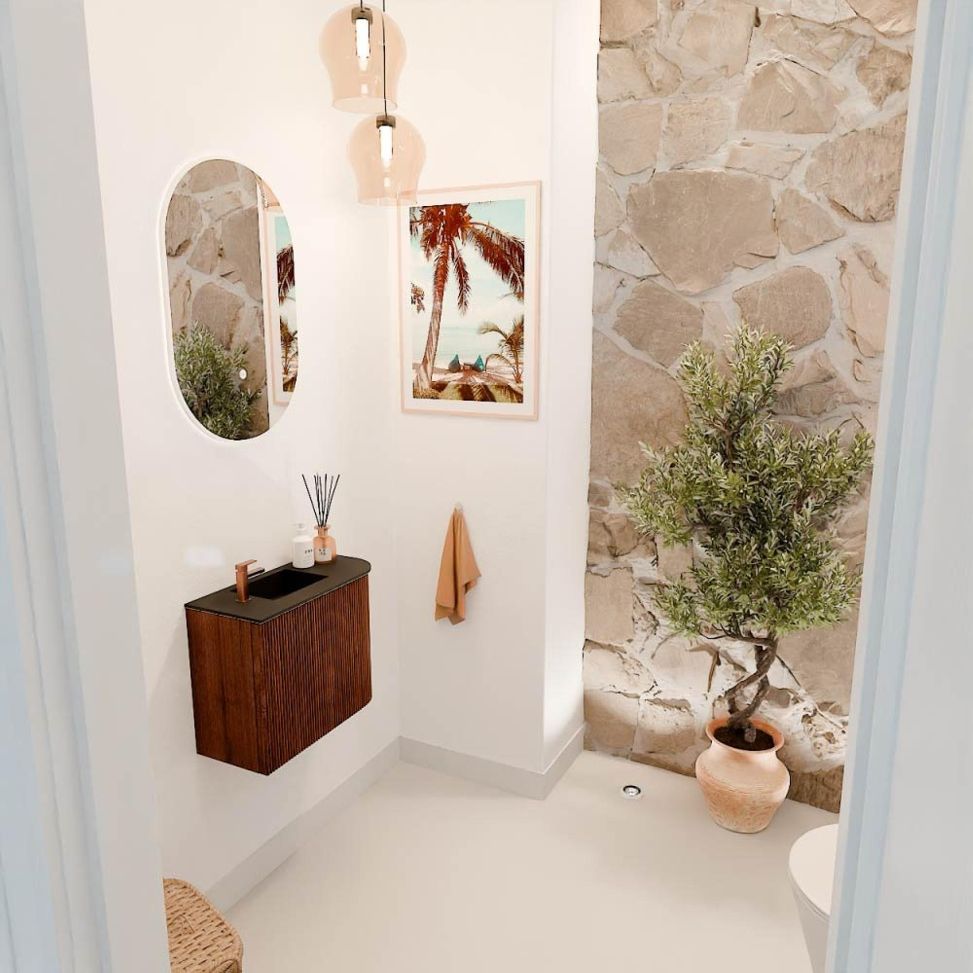 Met dit prachtige meubel geef je jouw badkamer of toiletruimte direct een stijlvolle en warme uitstraling. Het compacte formaat van net iets meer dan een halve meter breed maakt het ideaal voor kleinere ruimtes waar je toch niet wilt inleveren op design en functionaliteit. De combinatie van een subtiele ronding aan de rechterkant en de opvallende Ruby kleur zorgt voor een speels en modern accent. Daarbij is de wastafel met kraangat aan de linkerkant perfect afgestemd op praktisch gebruik, zodat je moeiteloos je dagelijkse routine kunt uitvoeren. De hoogwaardige materialen en het doordachte ontwerp transformeren jouw badkamer tot een plek waar je elke dag met plezier begint en eindigt.