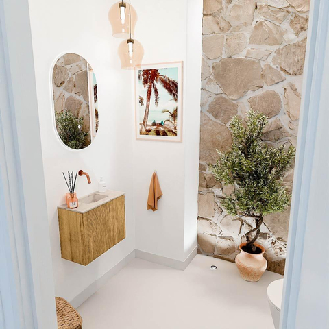 Met dit compacte meubel geef je jouw badkamer of toiletruimte direct een stijlvolle en praktische upgrade. Het combineert een warme, natuurlijke uitstraling dankzij de eikenhouten kleur met een moderne, strakke wastafel in een zachte frappe tint. Dankzij het slimme formaat van 50 cm breed past het perfect in kleinere ruimtes zonder in te leveren op comfort of opbergruimte. Het meubel is ontworpen om aan de wand te worden gemonteerd, wat zorgt voor een ruimtelijk effect en makkelijk schoon te houden is. De wastafel heeft een centraal geplaatste kom zonder kraangat, zodat je zelf de kraan kunt kiezen die het beste bij jouw stijl en wensen past. Zo creëer je een persoonlijke en functionele plek waar je elke dag met plezier begint en eindigt.