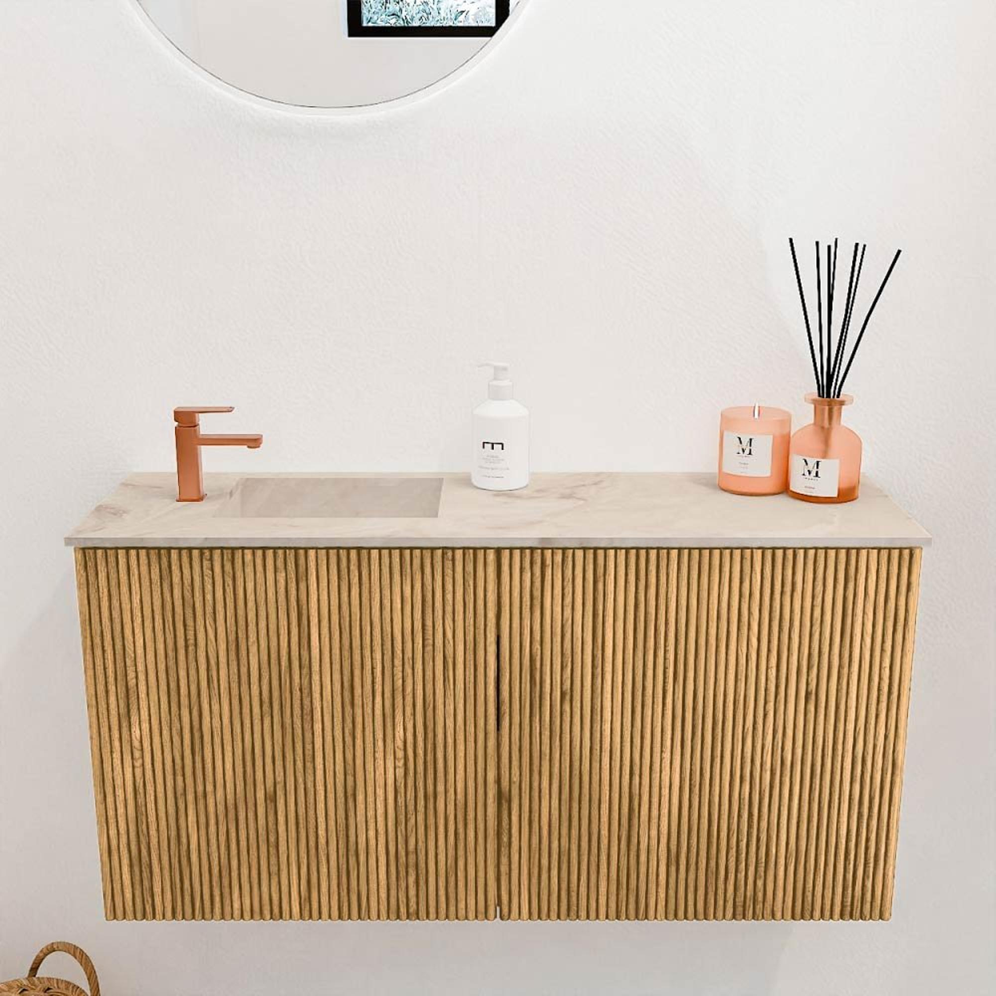 - Wastafelmodel FAYE met links geplaatst kraangat in de kleur Frappe voor een subtiel contrast