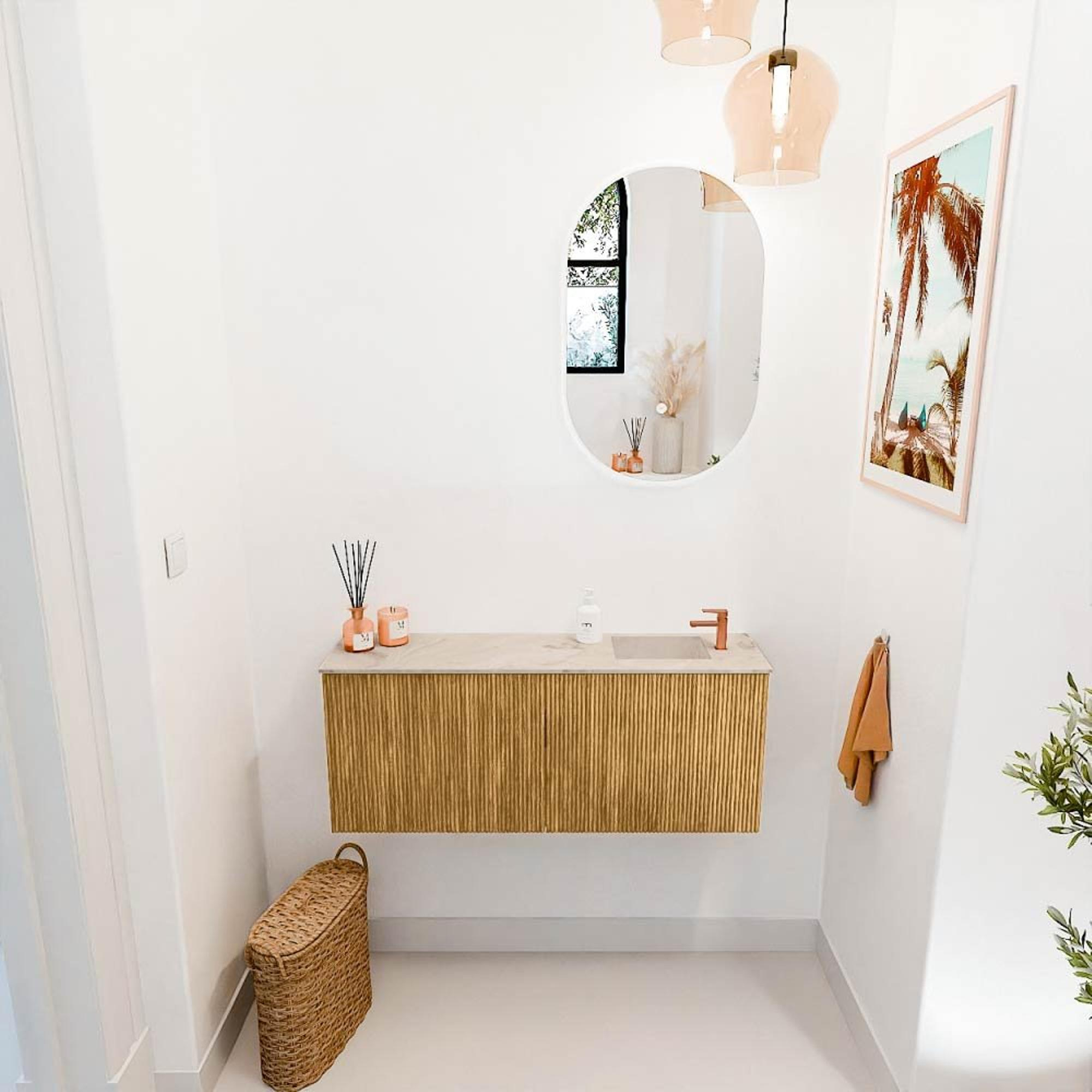 Het meubel straalt stijl en klasse uit dankzij het gebruik van hoogwaardig massief eikenhout gecombineerd met eikenfineer. De natuurlijke houtstructuur en warme kleur zorgen voor een uitnodigende sfeer in je badkamer. De verticale groeven geven het meubel een modern tintje, waardoor het naadloos aansluit bij diverse interieurstijlen. Dit stijlvolle ontwerp maakt van jouw badkamer een plek waar je trots op bent en waar je gasten met bewondering naar zullen kijken.