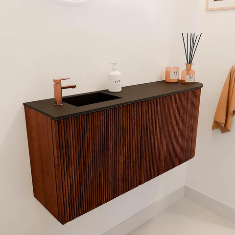 Het meubel valt direct op door zijn elegante ronding aan de rechterzijde en de verticale ribbelstructuur op de fronten. Deze details geven het geheel een moderne en verfijnde uitstraling die moeiteloos aansluit bij diverse badkamerstijlen. De combinatie van de diepe Ruby-kleur met de subtiele Urban tint van de wastafel zorgt voor een warm contrast dat jouw badkamer een unieke sfeer geeft. Door te kiezen voor dit meubel voeg je een stijlvol element toe dat zowel tijdloos als trendy is, waardoor je badkamer er altijd verzorgd en uitnodigend uitziet.