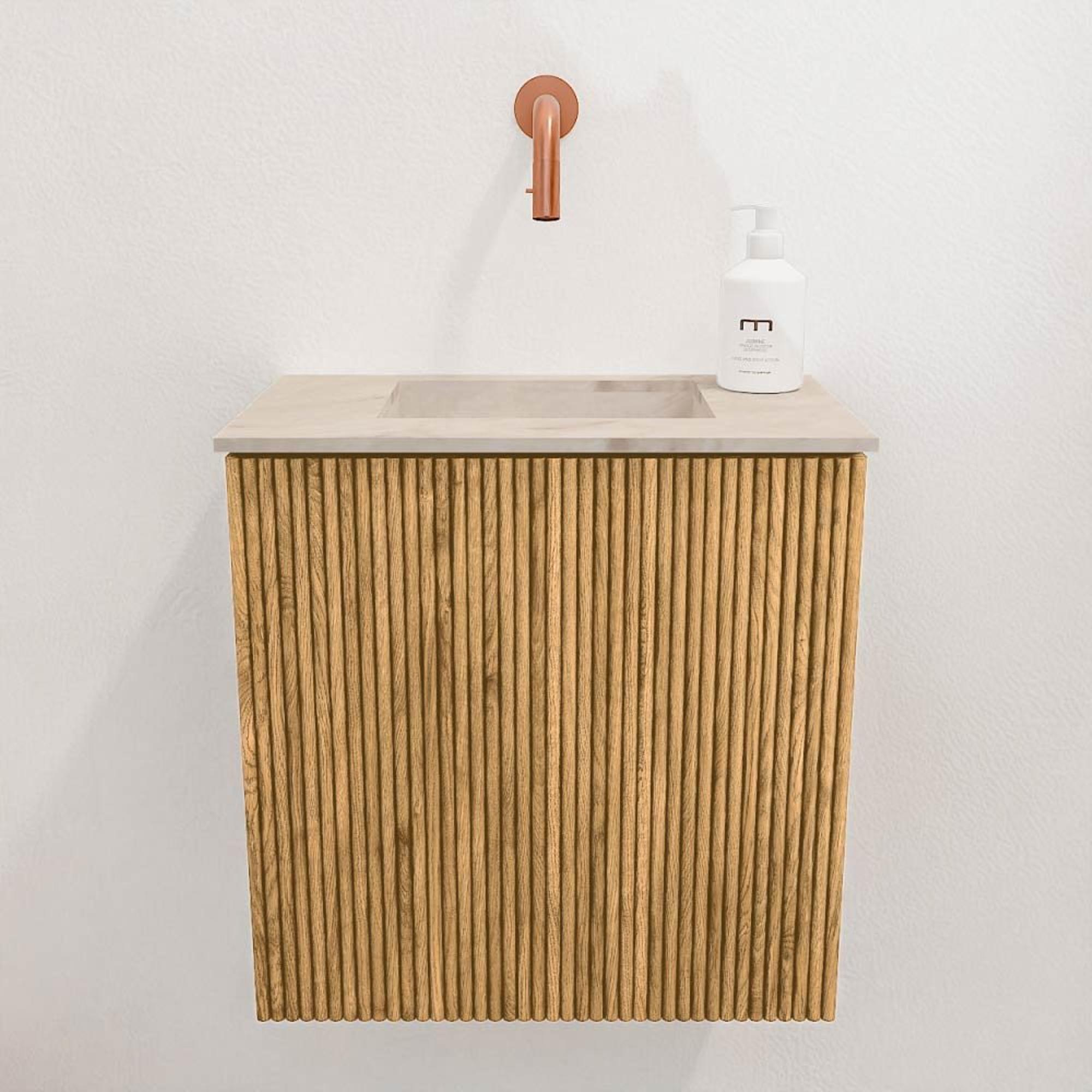 De natuurlijke eikenhouten fronten met verticale groeven geven het meubel een exclusieve en tijdloze uitstraling. Dit detail zorgt voor een subtiele textuur die het geheel net dat beetje extra karakter geeft. Door de warme houtkleur past het meubel moeiteloos in diverse interieurstijlen, van modern tot klassiek. Zo creëer je een harmonieuze sfeer die rust en comfort uitstraalt. Het design is zorgvuldig uitgebalanceerd, waardoor het meubel niet alleen mooi oogt, maar ook een echte blikvanger wordt in jouw badkamer.