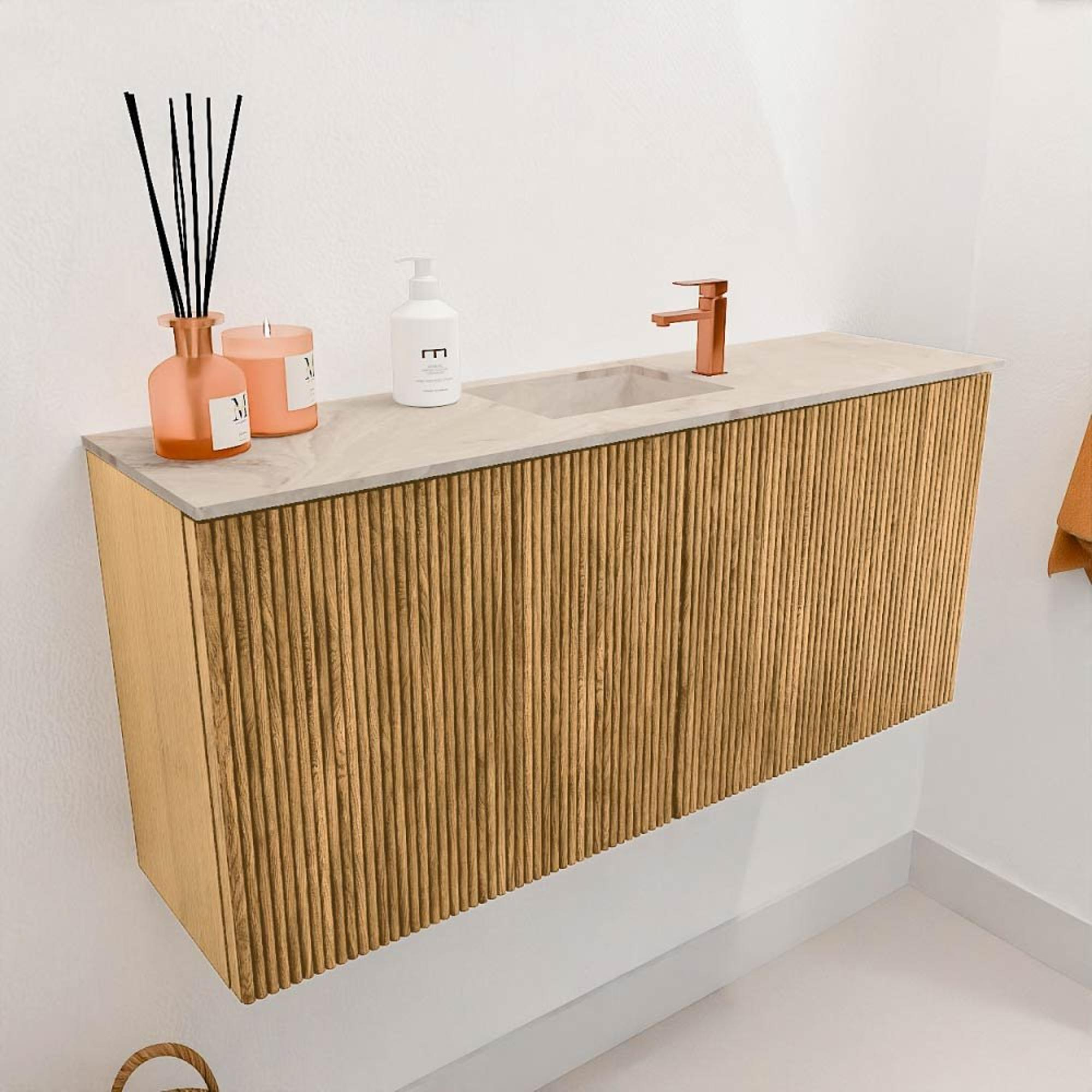 De combinatie van massief eikenhout en eikenfineer geeft dit meubel een natuurlijke en luxe uitstraling die je badkamer direct naar een hoger niveau tilt. De verticale groeven zorgen voor een eigentijdse twist, waardoor het meubel niet alleen tijdloos is maar ook verrassend modern oogt. Door de warme oak kleur voelt de ruimte uitnodigend en gezellig aan. Dit stijlvolle design past moeiteloos bij verschillende interieurstijlen, van klassiek tot Scandinavisch en modern. Zo geniet je van een meubel dat niet alleen functioneel is, maar ook een echte blikvanger in je badkamer.