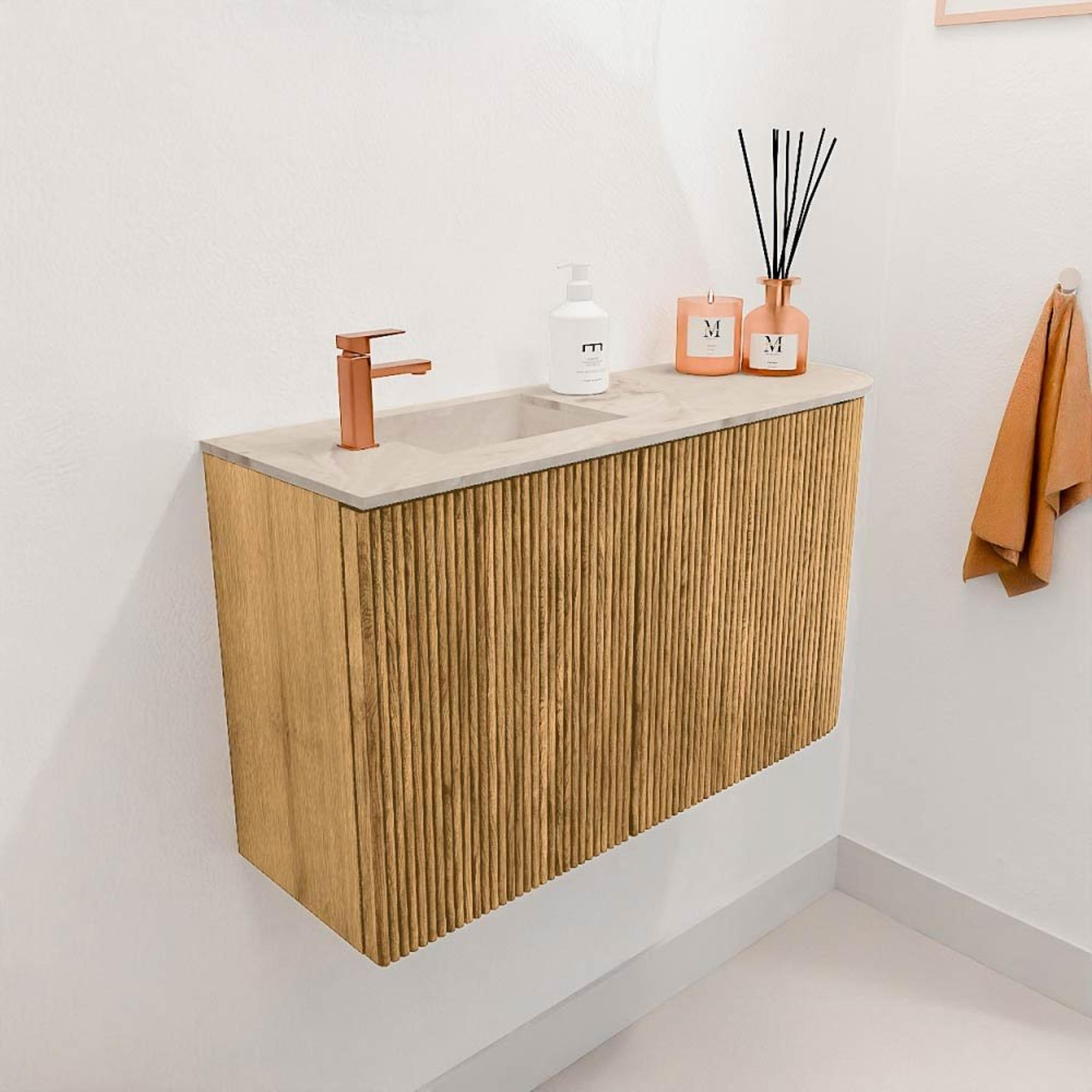 De warme eikenkleur en het subtiele design maken dit meubel tot een echte blikvanger in je badkamer. De verticale ribbels geven het meubel een moderne twist, terwijl de natuurlijke houtstructuur zorgt voor een authentieke en gezellige sfeer. Door de afgeronde rechterkant krijgt het meubel een speels en uniek karakter, wat het onderscheidt van standaard badkamermeubels. Zo voeg je met dit meubel niet alleen functionaliteit toe, maar ook een stijlvol element dat je badkamer compleet maakt.