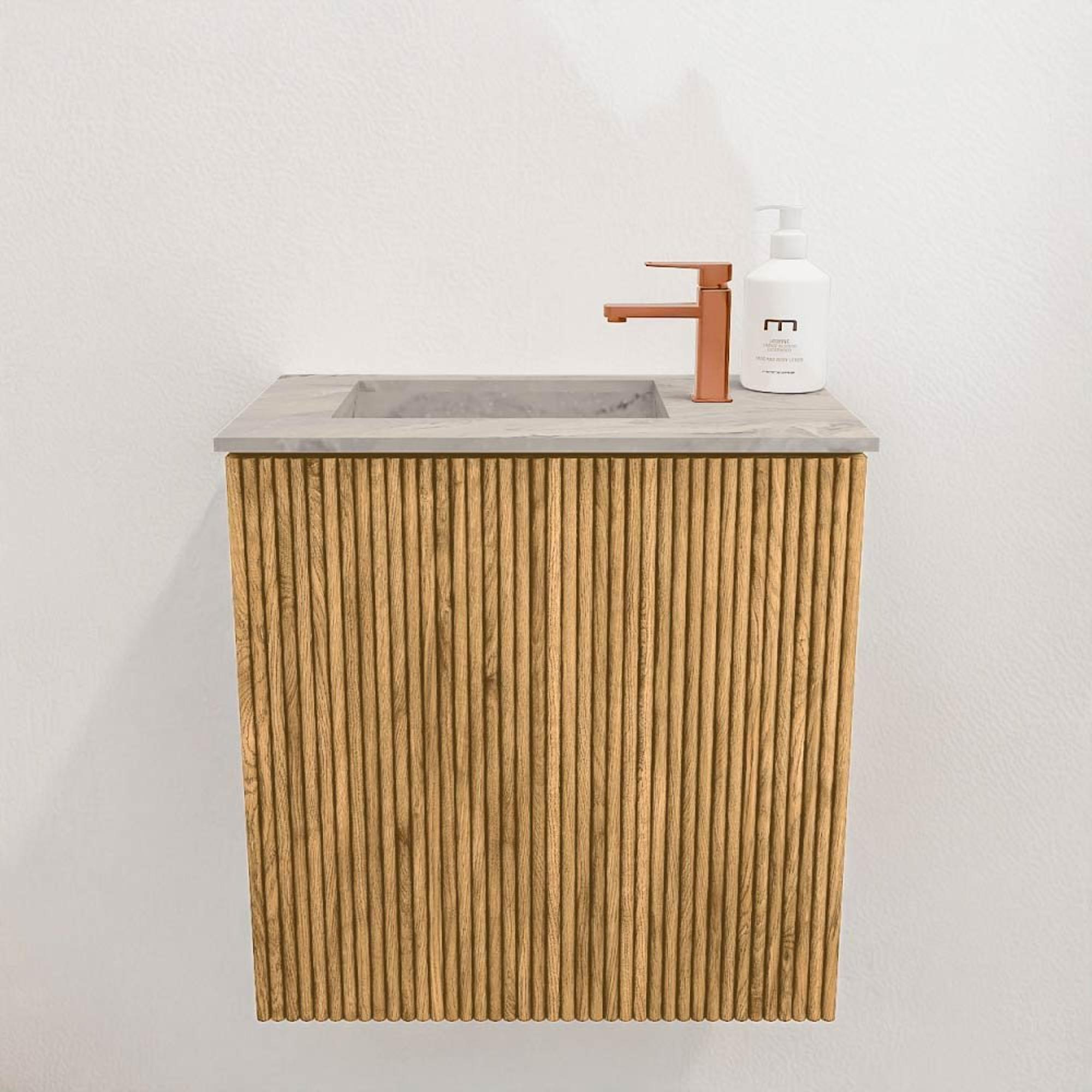 Ondanks het compacte formaat biedt dit meubel verrassend veel opbergruimte achter de deur. Hier berg je eenvoudig je badkamerbenodigdheden netjes op, zodat je wastafelblad vrij blijft en je badkamer er altijd opgeruimd uitziet. De wastafel met links geplaatst kraangat is ideaal voor een kraan naar keuze en zorgt voor een praktische indeling die aansluit bij jouw wensen. Dankzij de wandmontage creëer je bovendien extra ruimte op de vloer, wat bijdraagt aan een ruimtelijk gevoel in je badkamer.