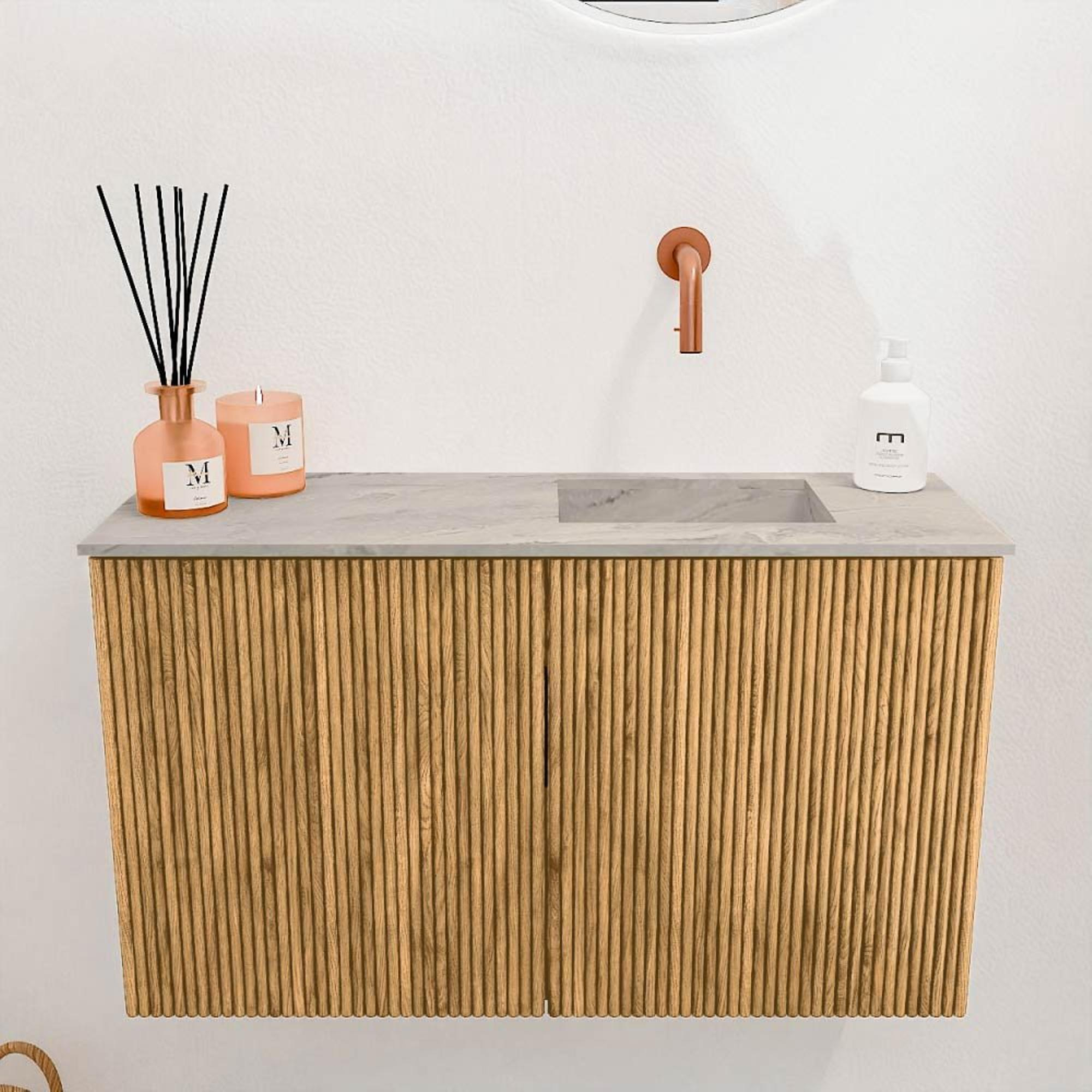 Met een breedte van 70 cm en een diepte van slechts 24,5 cm is dit meubel ideaal voor kleinere ruimtes zoals een gastentoilet. De twee deuren bieden voldoende opbergruimte om toiletartikelen netjes uit het zicht te houden, wat bijdraagt aan een opgeruimde en rustgevende sfeer. De wandmontage zorgt ervoor dat de vloer vrij blijft, wat het schoonmaken vergemakkelijkt en de ruimte optisch groter doet lijken. Daarnaast is de wastafel zonder kraangat uitgevoerd, waardoor je zelf de keuze hebt voor een kraan die het beste bij jouw wensen past.