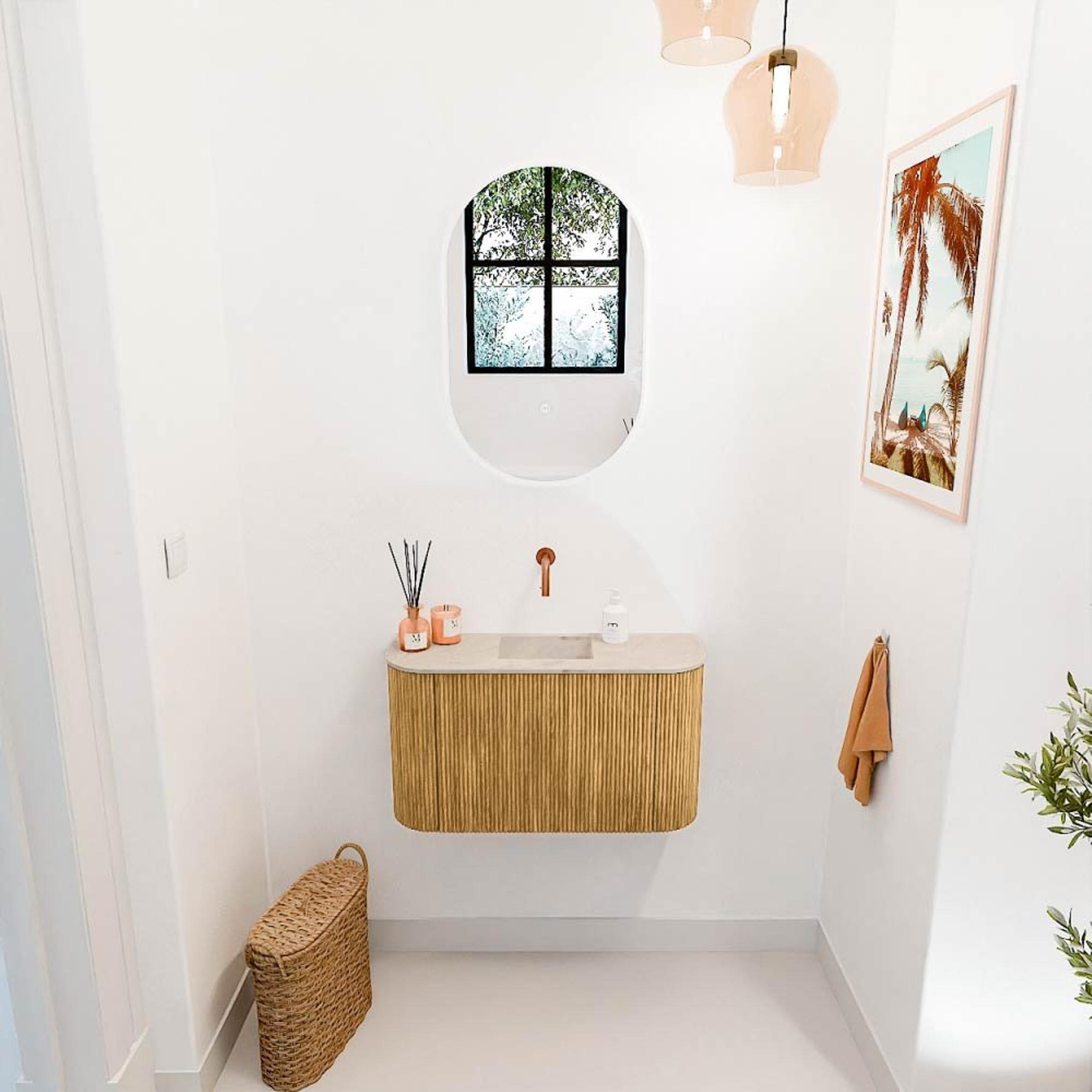 De combinatie van massief eikenhout en eikenfineer zorgt voor een warme, natuurlijke uitstraling die nooit uit de mode raakt. De verticale groeven op de fronten geven het meubel een eigentijdse twist, waardoor het zowel klassiek als modern oogt. Dit maakt het meubel uitermate geschikt voor uiteenlopende badkamerstijlen, van landelijk tot strak en minimalistisch. Door de subtiele rondingen aan de zijkanten oogt het geheel vriendelijk en uitnodigend. Zo voeg je niet alleen een functioneel element toe, maar ook een stijlvol pronkstuk dat jouw badkamer een unieke sfeer geeft.
