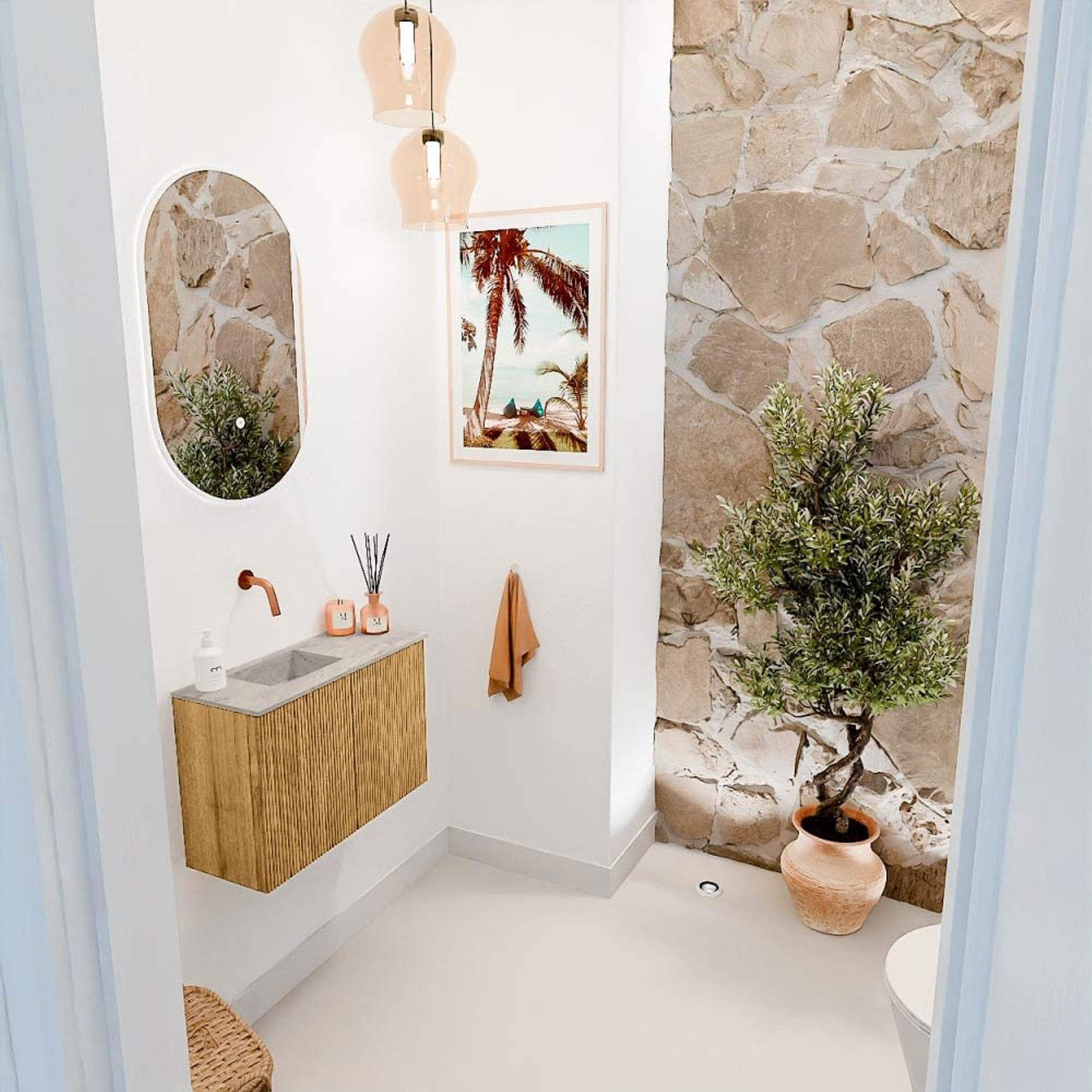 Met dit prachtige meubel geef je jouw badkamer een warme, natuurlijke uitstraling die direct uitnodigt tot ontspanning. Het combineert de tijdloze charme van massief eikenhout met een strak, modern design, waardoor het een echte blikvanger wordt in elke ruimte. Dankzij de slimme afmetingen van 60 cm breedte past het perfect in zowel compacte als ruime badkamers, zonder in te leveren op opbergruimte of stijl. De wastafel, subtiel gepositioneerd aan de linkerkant, biedt volop gebruiksgemak en is uitgevoerd in een zachte glace-kleur die prachtig contrasteert met het warme eikenhout. Dit meubel is niet alleen een lust voor het oog, maar ook een praktische toevoeging die jouw dagelijkse routine een stuk aangenamer maakt. Door de wandmontage oogt het meubel luchtig en ruimtelijk, wat bijdraagt aan een frisse en verzorgde badkamerbeleving. Zo transformeer je jouw badkamer in een plek waar je elke dag met plezier begint en eindigt.