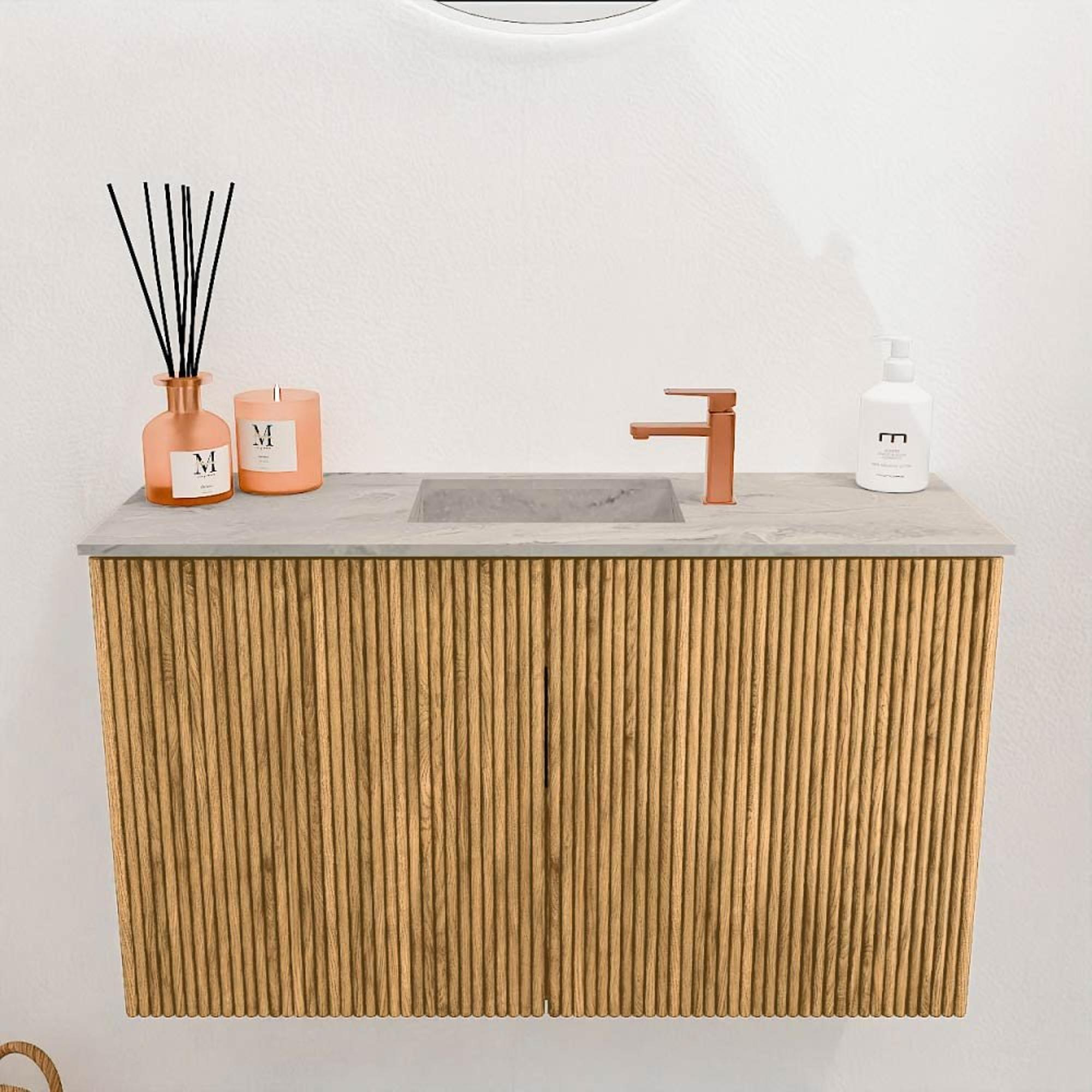 Met twee ruime deuren biedt dit meubel voldoende opbergruimte om al je badkamerbenodigdheden netjes uit het zicht te houden. De wastafel met één kraangat in het midden is ideaal voor een enkele kraan en zorgt voor een overzichtelijke en efficiënte indeling. Het meubel is wandgemonteerd, waardoor je de vloer vrij houdt en de ruimte optisch groter lijkt. Dit maakt het perfect voor kleinere badkamers of toiletten waar elke centimeter telt. Zo combineer je stijl met slimme oplossingen die jouw badkamerpraktijk verbeteren.