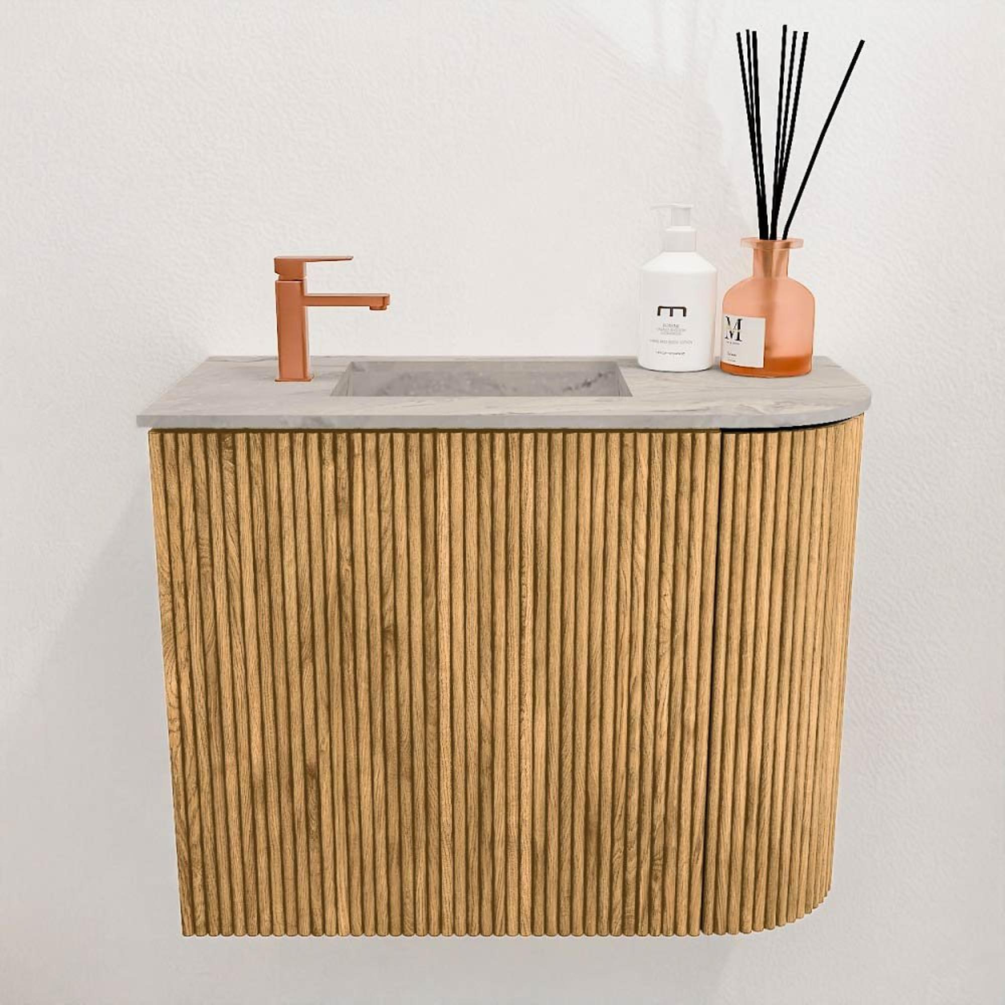 De warme eikenhouten afwerking met verticale groeven geeft het meubel een elegante en natuurlijke uitstraling die direct opvalt. Door de subtiele ronding aan de rechterkant krijgt het ontwerp een speels en modern karakter, zonder dat het te opvallend wordt. Deze combinatie van vorm en materiaal zorgt ervoor dat het meubel moeiteloos past in zowel klassieke als eigentijdse badkamers. Zo creëer je een harmonieuze ruimte waarin je elke dag met plezier begint en eindigt.