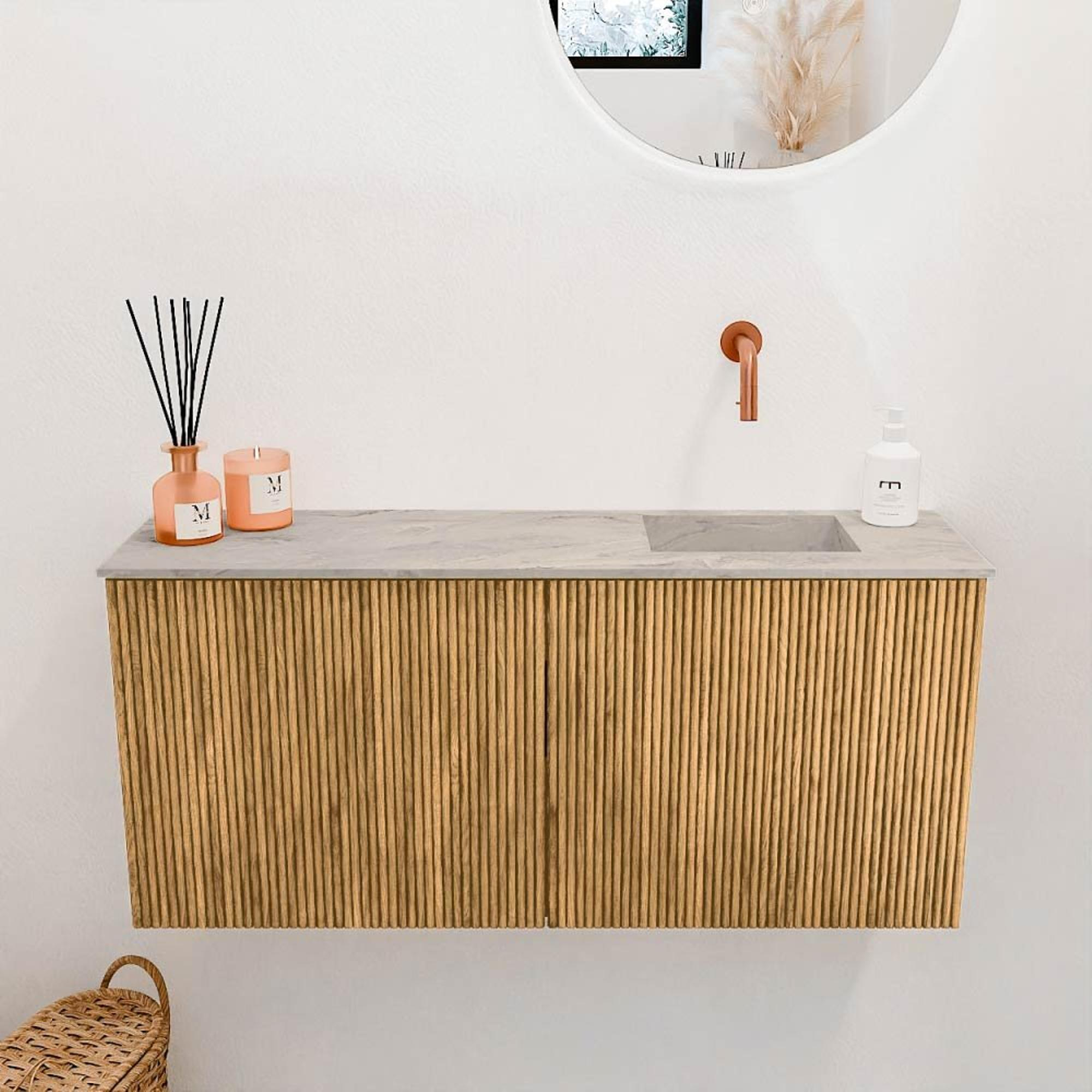 Het meubel is een toonbeeld van stijlvolle eenvoud. De warme eikenkleur met verticale groeven geeft het een natuurlijke en luxe uitstraling die moeiteloos in verschillende badkamerinterieurs past. De combinatie van hout en de lichte glace wastafel zorgt voor een frisse, uitnodigende look. Dit meubel is niet alleen een functioneel element, maar ook een echte blikvanger die jouw badkamer een eigentijdse en warme sfeer geeft. Zo geniet je elke dag van een badkamer die er niet alleen mooi uitziet, maar ook een gevoel van rust en comfort uitstraalt.