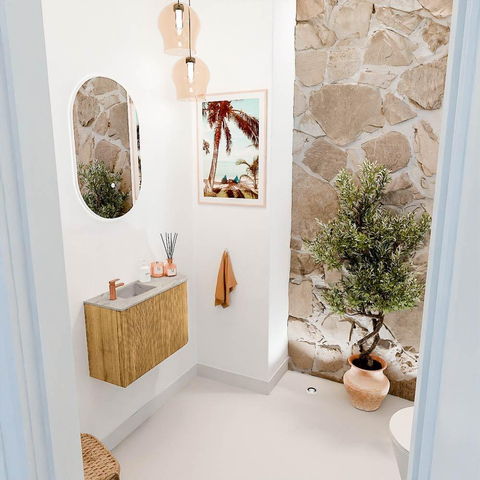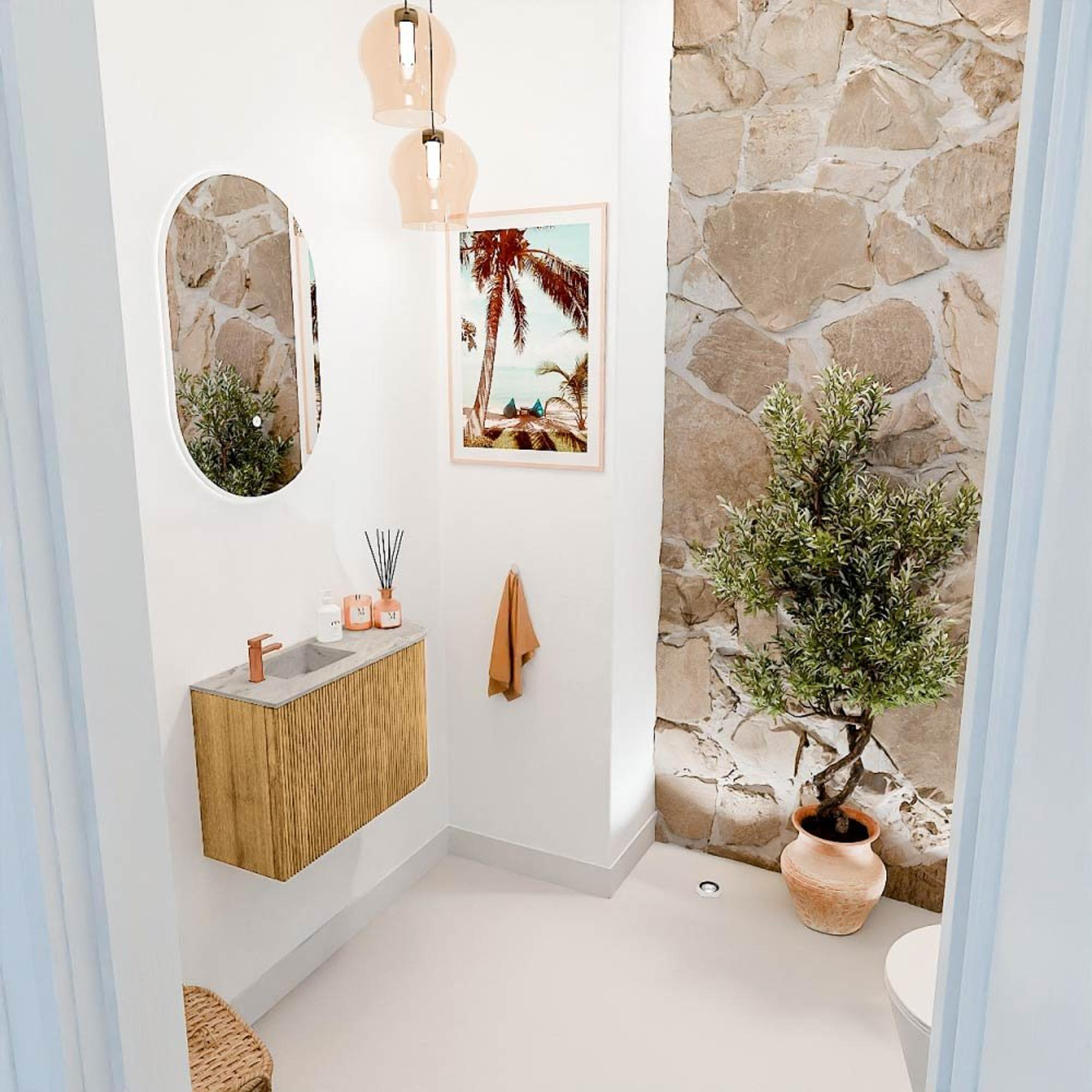 De warme eikenkleur en de verticale groeven in het meubel geven het een exclusieve en tijdloze uitstraling. Dit meubel past perfect in zowel moderne als klassieke badkamers en voegt direct karakter toe. De subtiele ronding aan de rechterkant zorgt voor een speels en elegant detail dat je badkamer net dat beetje extra geeft. Met dit meubel kies je voor een design dat niet alleen mooi is, maar ook een echte blikvanger wordt in jouw ruimte.