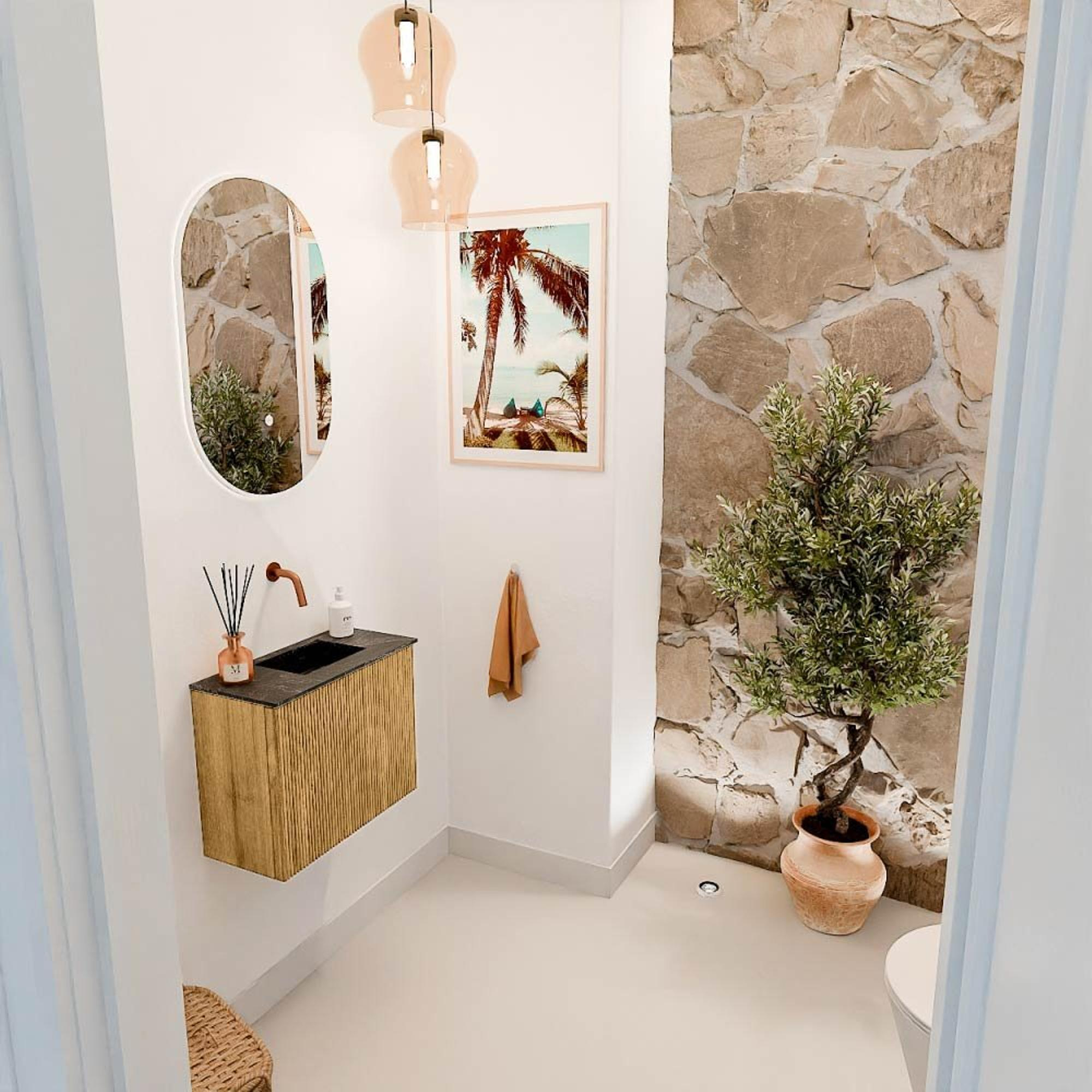 De natuurlijke eikenhouten afwerking geeft het meubel een warme en uitnodigende uitstraling. De verticale groeven op de deur zorgen voor een verfijnde, moderne look die direct opvalt. Door de combinatie met de lava-kleurige wastafel ontstaat een subtiel contrast dat elegantie toevoegt zonder te overheersen. Dit meubel past daardoor moeiteloos in zowel klassieke als eigentijdse badkamers. Je creëert zo een stijlvolle sfeer die rust en comfort uitstraalt, precies wat je wilt in een ruimte waar je tot jezelf komt.