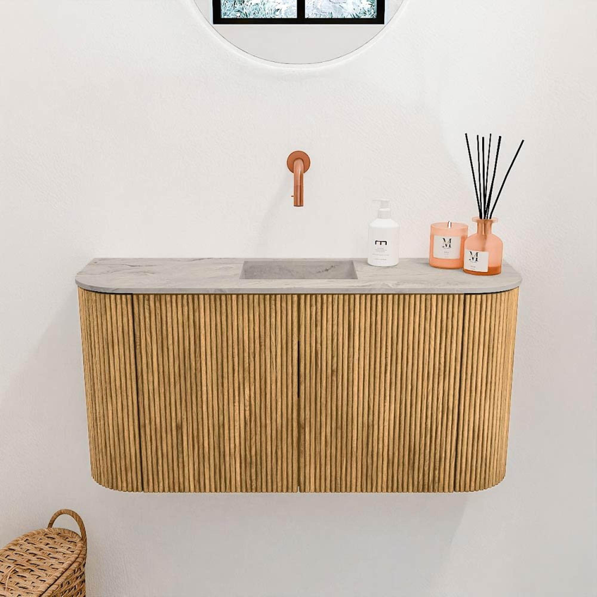 Het meubel valt direct op door zijn natuurlijke oak kleur en de subtiele rondingen aan beide kanten. Deze combinatie zorgt voor een warme en uitnodigende uitstraling die perfect aansluit bij diverse interieurstijlen. Of je nu een moderne, landelijke of industriële badkamer hebt, dit meubel voegt altijd een verfijnde touch toe. De frisse glace wastafel in het midden zorgt voor een mooi contrast en geeft het geheel een lichte en luchtige uitstraling. Zo creëer je een badkamer die niet alleen functioneel is, maar ook een echte blikvanger.