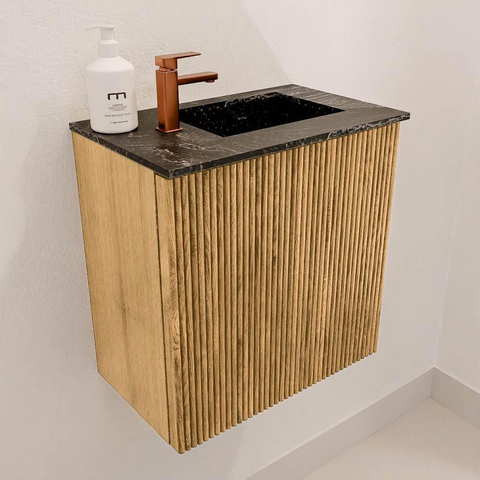 Het meubel valt direct op door het gebruik van massief eikenhout aan de voorkant, gecombineerd met eiken fineer aan de zijkanten. Deze natuurlijke materialen geven een warme en authentieke uitstraling die perfect past in zowel moderne als klassieke badkamers. De verticale groeven in het design zorgen voor een subtiele, maar onderscheidende touch die het meubel een unieke karakter geeft. De lava-kleurige wastafel voegt een eigentijdse twist toe, waardoor het geheel fris en uitnodigend oogt. Zo voeg je moeiteloos een stijlvol element toe aan je badkamer, dat jarenlang mooi blijft.