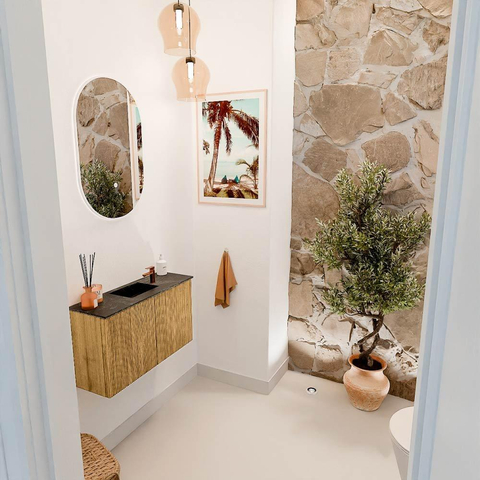 Met dit prachtige meubel geef je jouw badkamer direct een stijlvolle en warme uitstraling. Het compacte formaat van 70 cm breed maakt het ideaal voor zowel kleinere als grotere ruimtes, terwijl de natuurlijke Oak-kleur een rustgevende sfeer creëert. De combinatie met de Lava-kleurige wastafel zorgt voor een subtiel contrast dat de aandacht trekt zonder te overheersen. Dankzij het slimme ontwerp met twee deuren heb je voldoende opbergruimte om je badkamer netjes en overzichtelijk te houden. Dit meubel is niet alleen een lust voor het oog, maar ook uiterst praktisch en duurzaam. Het wandmodel zorgt voor een ruimtelijk gevoel en maakt schoonmaken een stuk eenvoudiger. Zo geniet je elke dag van een badkamer die niet alleen mooi oogt, maar ook perfect aansluit op jouw wensen en leefstijl.