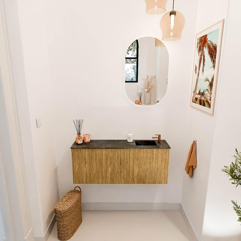 De warme oak-kleur van het meubel geeft je badkamer een natuurlijke en tijdloze uitstraling. Dit zorgt voor een rustgevende sfeer die uitnodigt tot ontspanning. De lava-kleurige wastafel voegt een modern accent toe, waardoor het geheel een eigentijdse en luxe uitstraling krijgt. Door de combinatie van deze kleuren en materialen past het meubel moeiteloos in diverse interieurstijlen, van klassiek tot modern. Zo geniet je van een badkamer die niet alleen functioneel is, maar ook een echte blikvanger vormt.