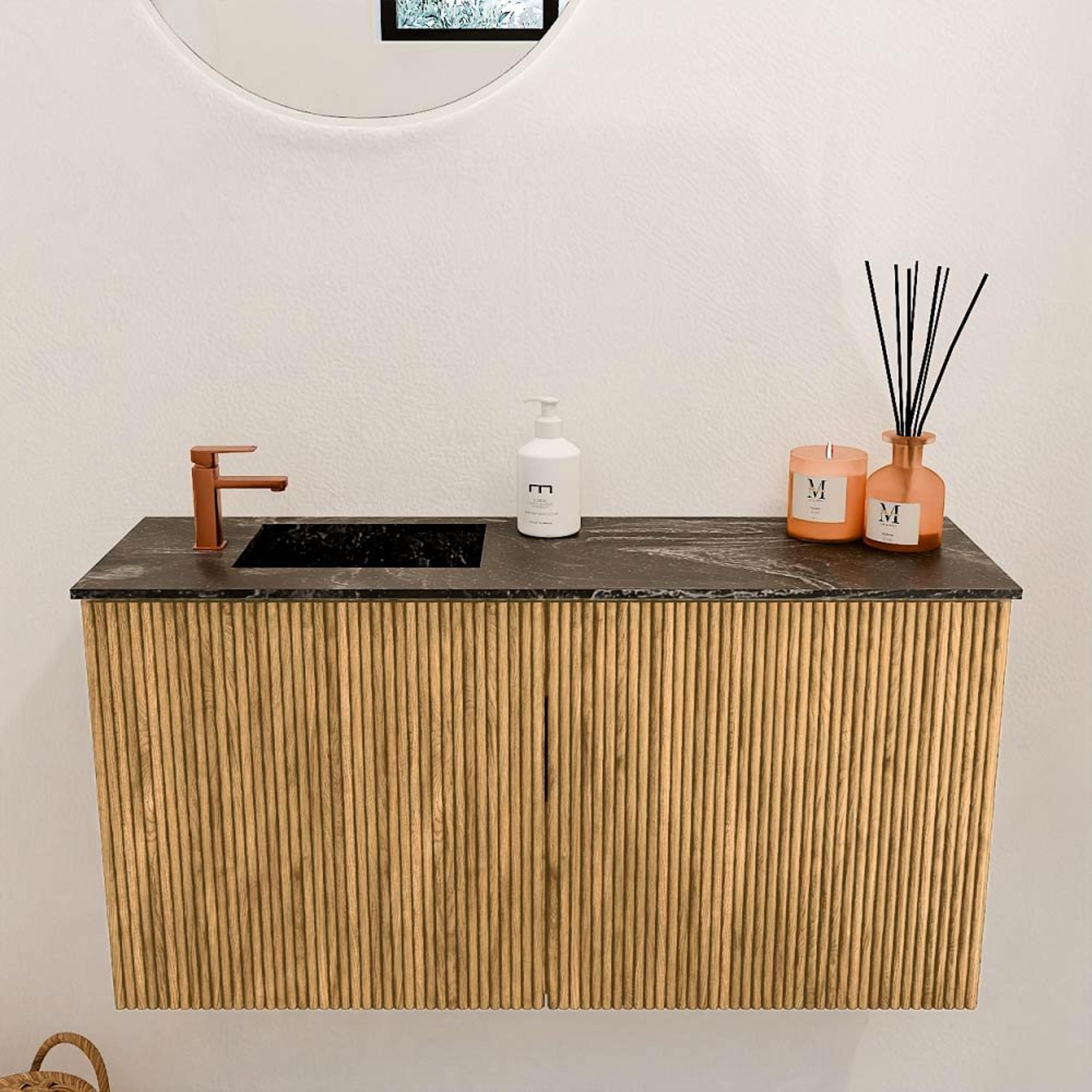 De combinatie van het eikenhout en de lava-kleurige wastafel zorgt voor een tijdloze en elegante uitstraling. Dit meubel past moeiteloos in zowel moderne als klassieke badkamers. De warme houttinten brengen een natuurlijke rust en maken het geheel uitnodigend. Door het subtiele design en de hoogwaardige materialen straalt het meubel kwaliteit en klasse uit. Zo creëer je een badkamer die niet alleen functioneel is, maar ook een echte blikvanger.