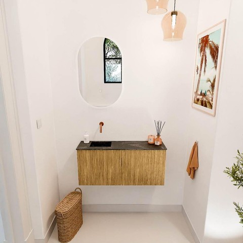 Met dit prachtige meubel geef je jouw badkamer of toiletruimte direct een stijlvolle en warme uitstraling. Het compacte ontwerp van 90 cm breed past perfect in kleinere ruimtes, zonder dat je inlevert op gebruiksgemak. De combinatie van het natuurlijke eikenhout met de strakke, moderne wastafel in lava-kleur zorgt voor een tijdloze sfeer waarin je elke dag weer geniet. Dankzij de slimme opbergruimte berg je al je badkamerbenodigdheden netjes en overzichtelijk op, zodat je badkamer altijd rustig en opgeruimd oogt. Dit meubel is niet alleen een lust voor het oog, maar ook een praktische toevoeging die jouw dagelijkse routine een stuk aangenamer maakt.
