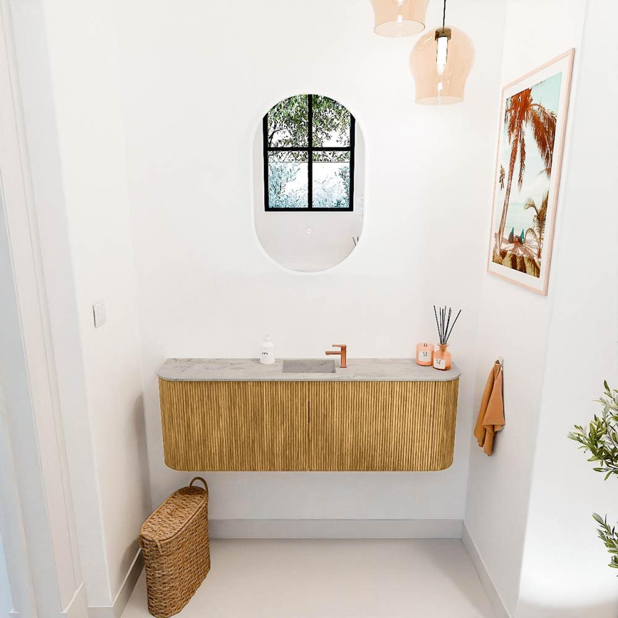 Het ontwerp van dit meubel is een perfecte balans tussen modern en klassiek. De ronde vormen aan beide zijden zorgen voor een zachte uitstraling die tegelijkertijd strak en verzorgd oogt. De verticale ribben in het eikenhout geven het meubel een luxe uitstraling die direct opvalt. Deze stijlvolle details maken het meubel tot een echte blikvanger in jouw badkamer, zonder dat het te overheersend wordt. Dankzij de neutrale kleur Oak past het moeiteloos bij verschillende interieurstijlen, van landelijk tot industrieel. Zo creëer je een harmonieuze sfeer waarin je je elke dag weer prettig voelt.
