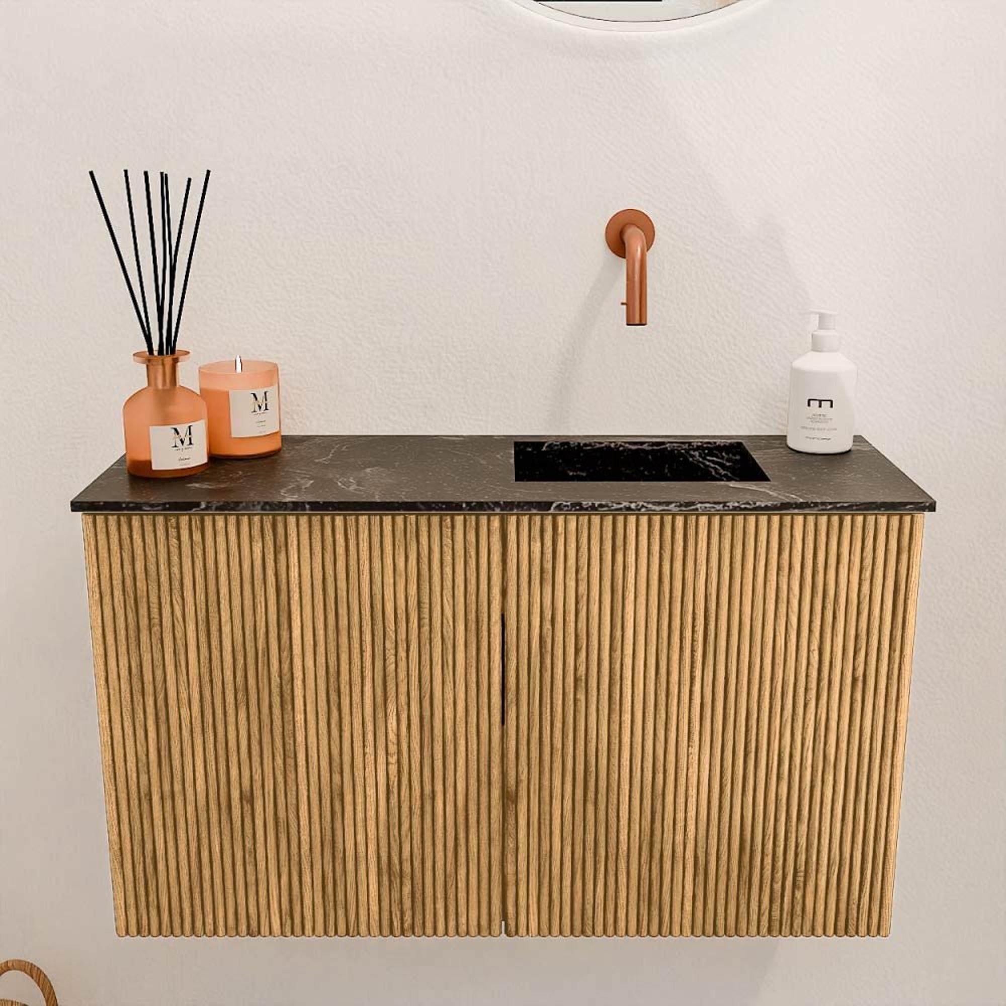 De combinatie van massief eikenhout aan de voorkant en eikenfineer aan de zijkanten geeft het meubel een natuurlijke en luxe uitstraling. Dit zorgt voor een warme sfeer in je badkamer die uitnodigt tot ontspanning. Het design is strak en minimalistisch, waardoor het meubel moeiteloos aansluit bij verschillende interieurstijlen. Door de subtiele lava-kleur van de wastafel ontstaat een fraai contrast dat het geheel een moderne twist geeft. Zo haal je een stijlvol pronkstuk in huis dat je badkamer direct naar een hoger niveau tilt.