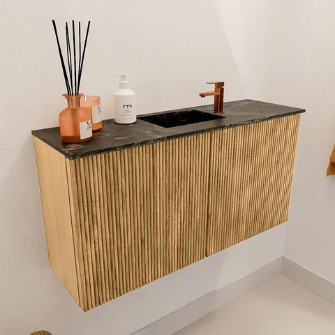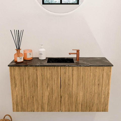 De warme eiken kleur met verticale ribstructuur geeft het meubel een natuurlijke en luxe uitstraling. De combinatie van massief eikenhout en eikenfineer zorgt voor een authentieke look die perfect past in zowel moderne als klassieke interieurs. De wastafel in lava kleur voegt een stoer contrast toe, waardoor het meubel een echte blikvanger wordt. Door het subtiele design en de hoogwaardige afwerking straalt het meubel klasse en verfijning uit, waardoor jouw toilet direct een stijlvolle upgrade krijgt.