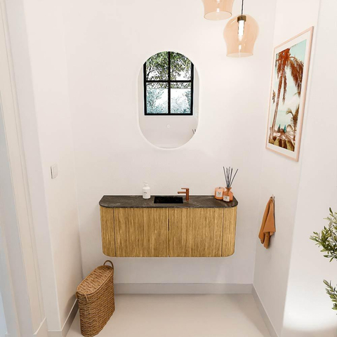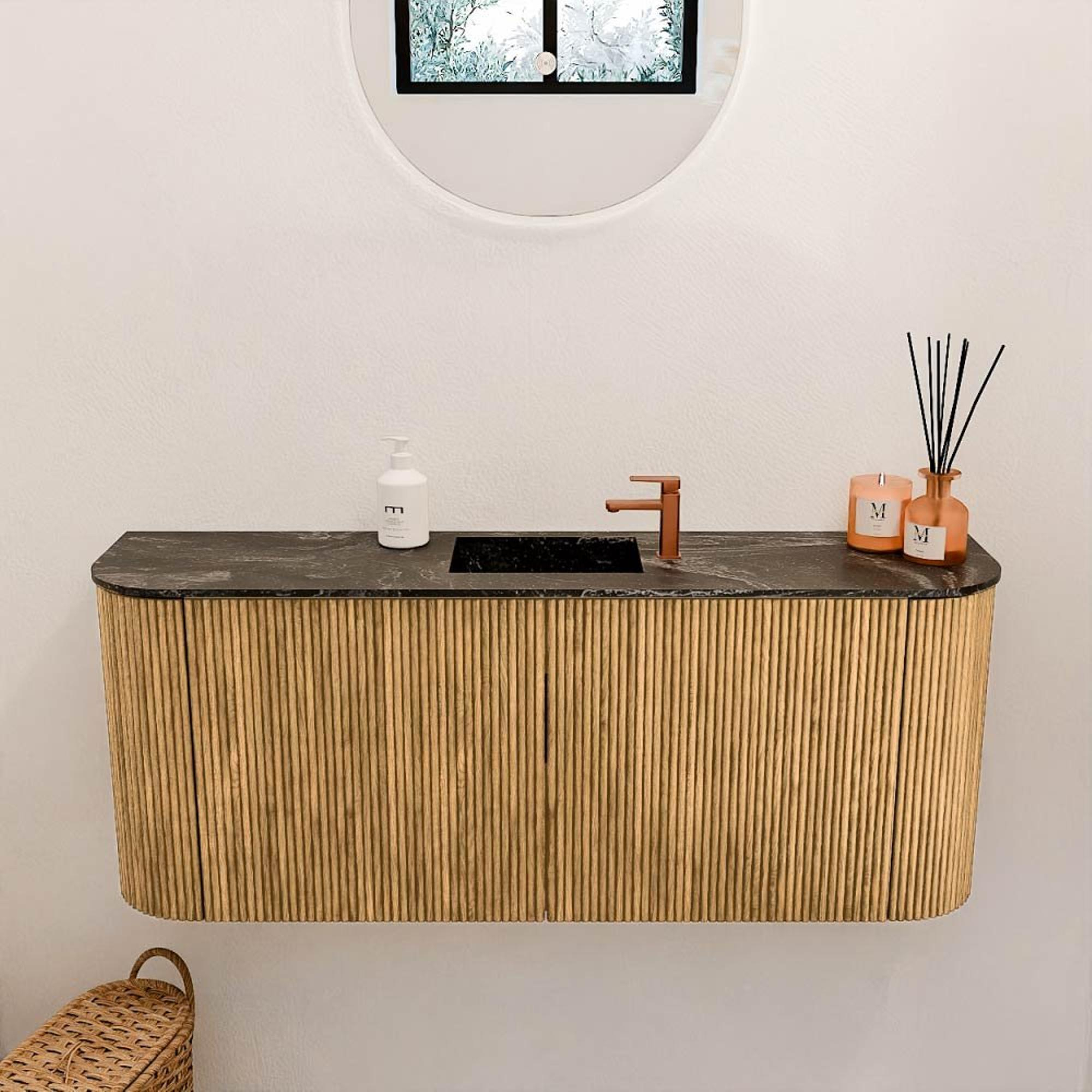 Het meubel valt direct op door zijn verfijnde ontwerp met afgeronde hoeken aan de linker- en rechterzijde. Deze subtiele details maken het geheel zachter en vriendelijker voor het oog, wat bijdraagt aan een harmonieuze badkamerinrichting. De combinatie van het warme eikenhout met de lava-kleurige wastafel zorgt voor een spannende, maar toch rustige uitstraling. Dit meubel past moeiteloos in zowel moderne als klassieke badkamers en geeft jouw ruimte een exclusieve uitstraling die je gasten zeker zullen waarderen.