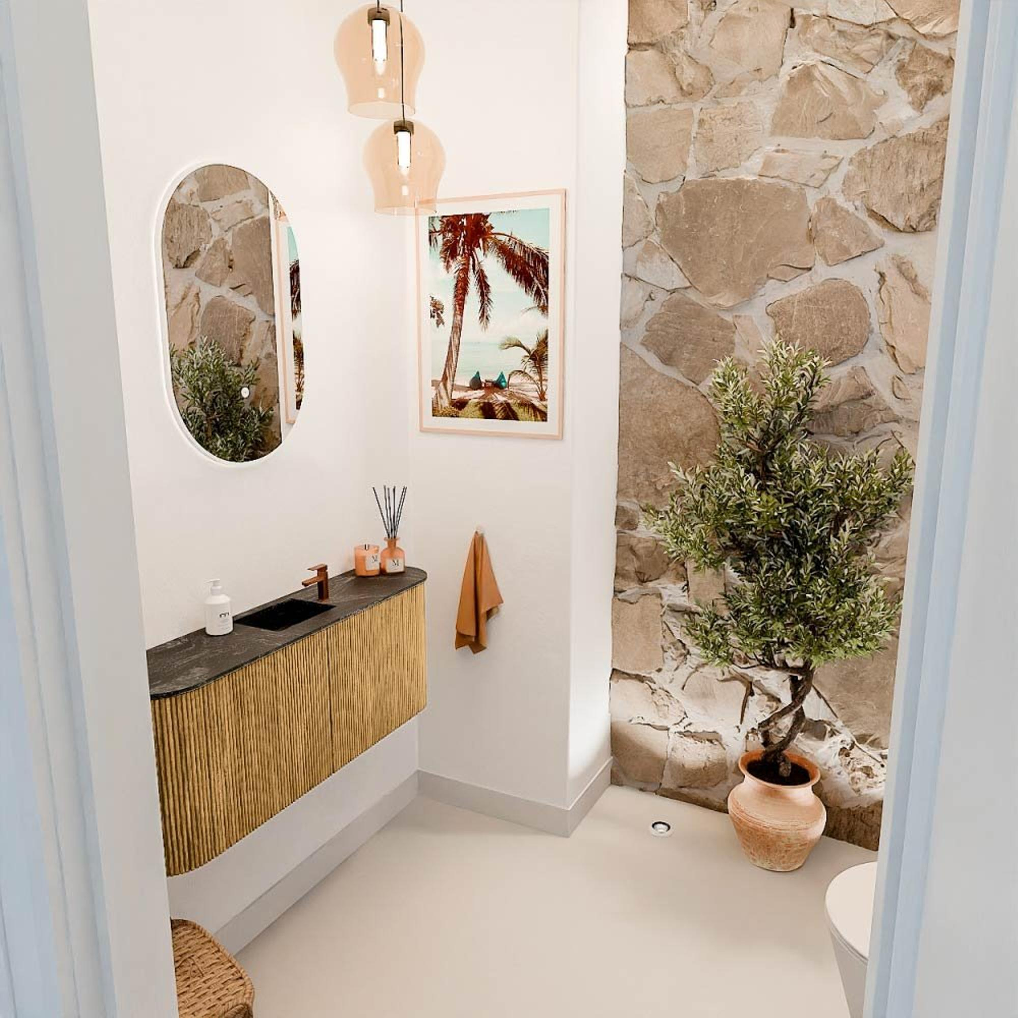 - Kleur: eikenhout gecombineerd met lava-kleurige wastafel – warm en modern