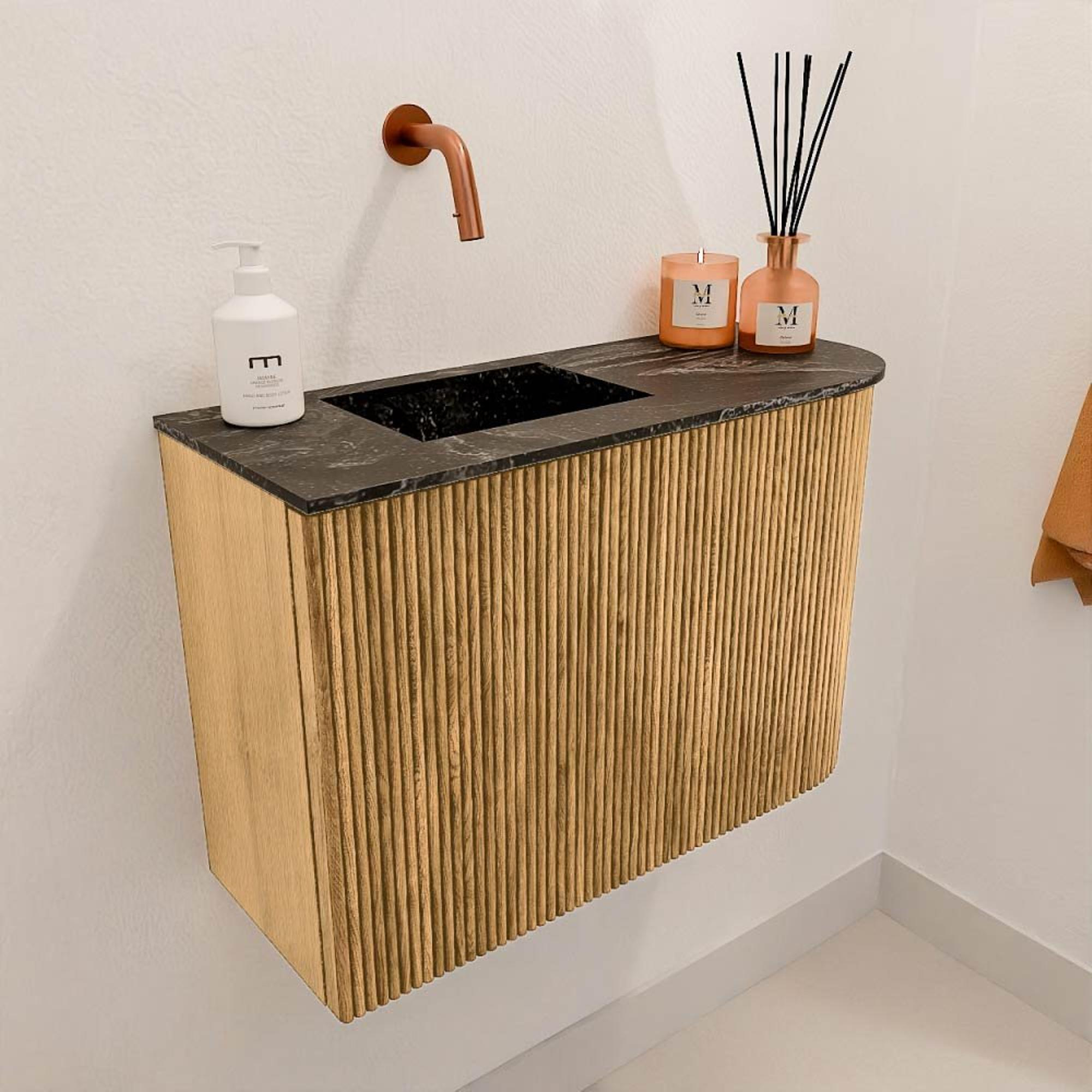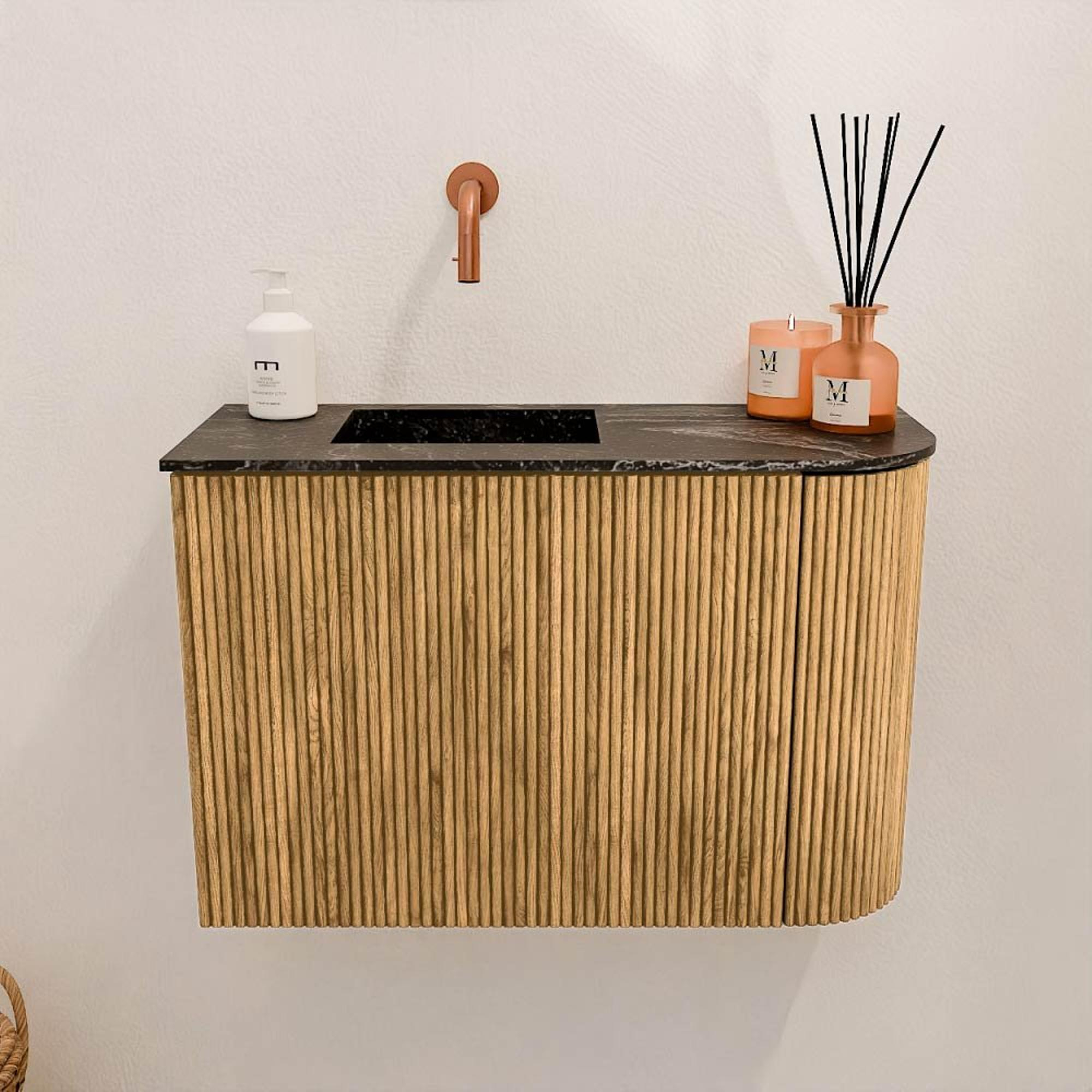 - Kleur: warme Oak-kleur met wastafel in Lava-kleur voor een stijlvol contrast
