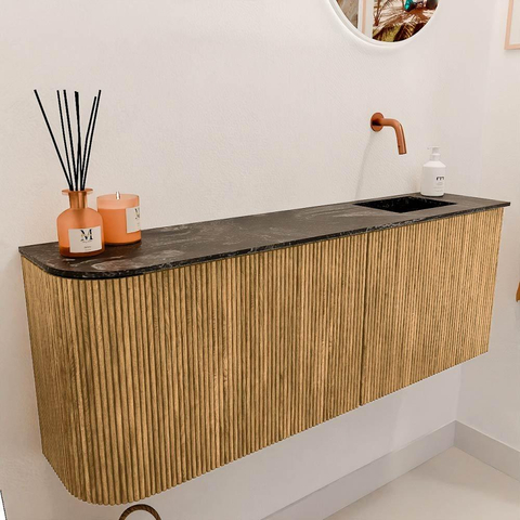 De warme Oak-kleur en de elegante ronding aan de linkerkant geven dit meubel een unieke uitstraling die je badkamer direct een luxe en natuurlijke sfeer geeft. Het gebruik van massief eikenhout en eikenfineer zorgt voor een authentieke en hoogwaardige afwerking. Dit meubel past perfect in zowel moderne als klassieke interieurs en voegt een vleugje tijdloze elegantie toe. Door de combinatie met de Lava-kleurige wastafel ontstaat een subtiel contrast dat je badkamer een eigentijdse uitstraling geeft zonder te overheersen.