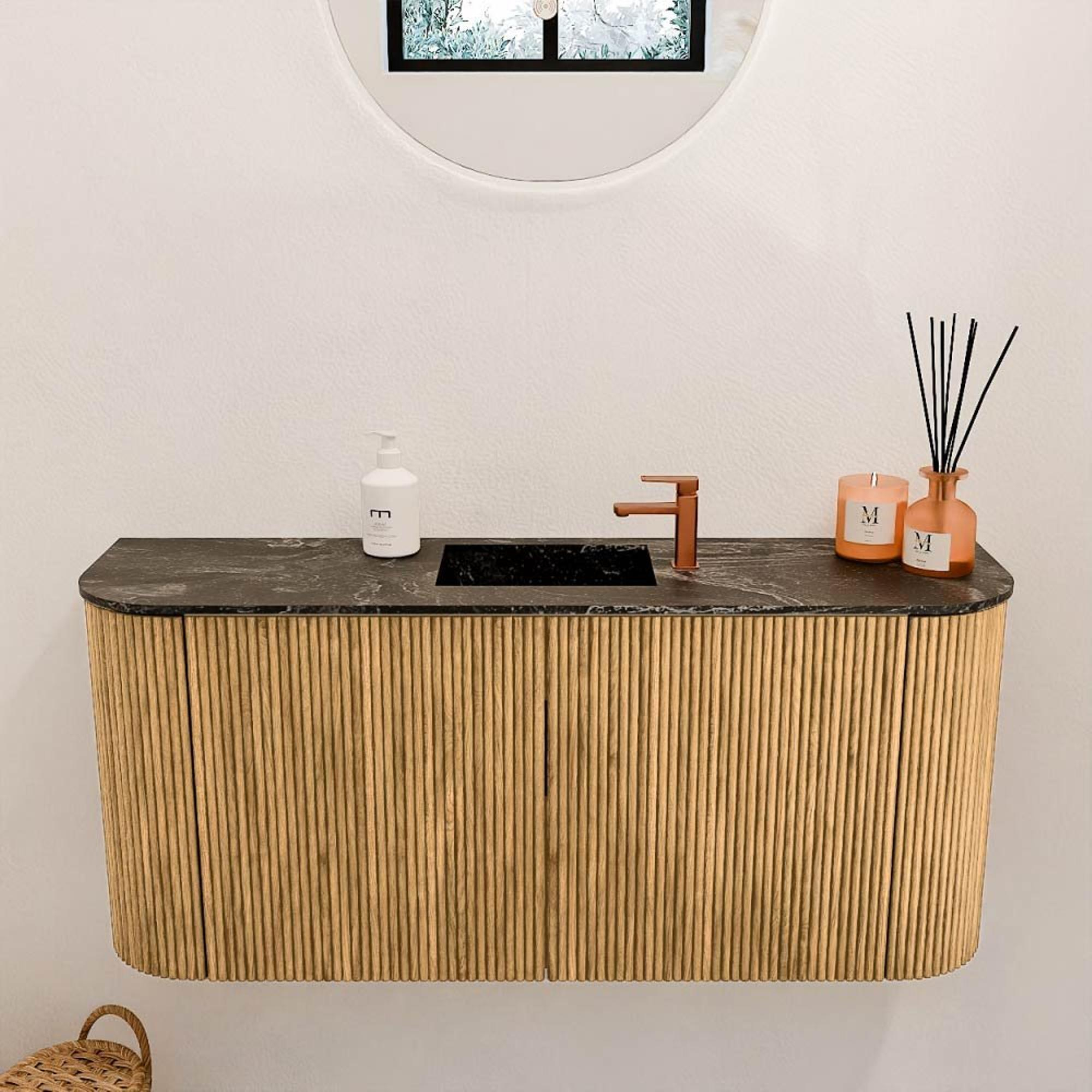De combinatie van de warme eikenkleur met de strakke lava wastafel geeft dit meubel een unieke, moderne uitstraling die toch tijdloos blijft. De subtiele rondingen aan de linker- en rechterzijde zorgen voor een zachte, uitnodigende look die in elk interieur past. Dit meubel is niet alleen een functioneel element, maar ook een echte blikvanger die de sfeer in jouw badkamer direct verhoogt. Door het doordachte design voeg je een vleugje luxe toe zonder te overdrijven, waardoor het meubel moeiteloos aansluit bij diverse stijlen, van landelijk tot industrieel.