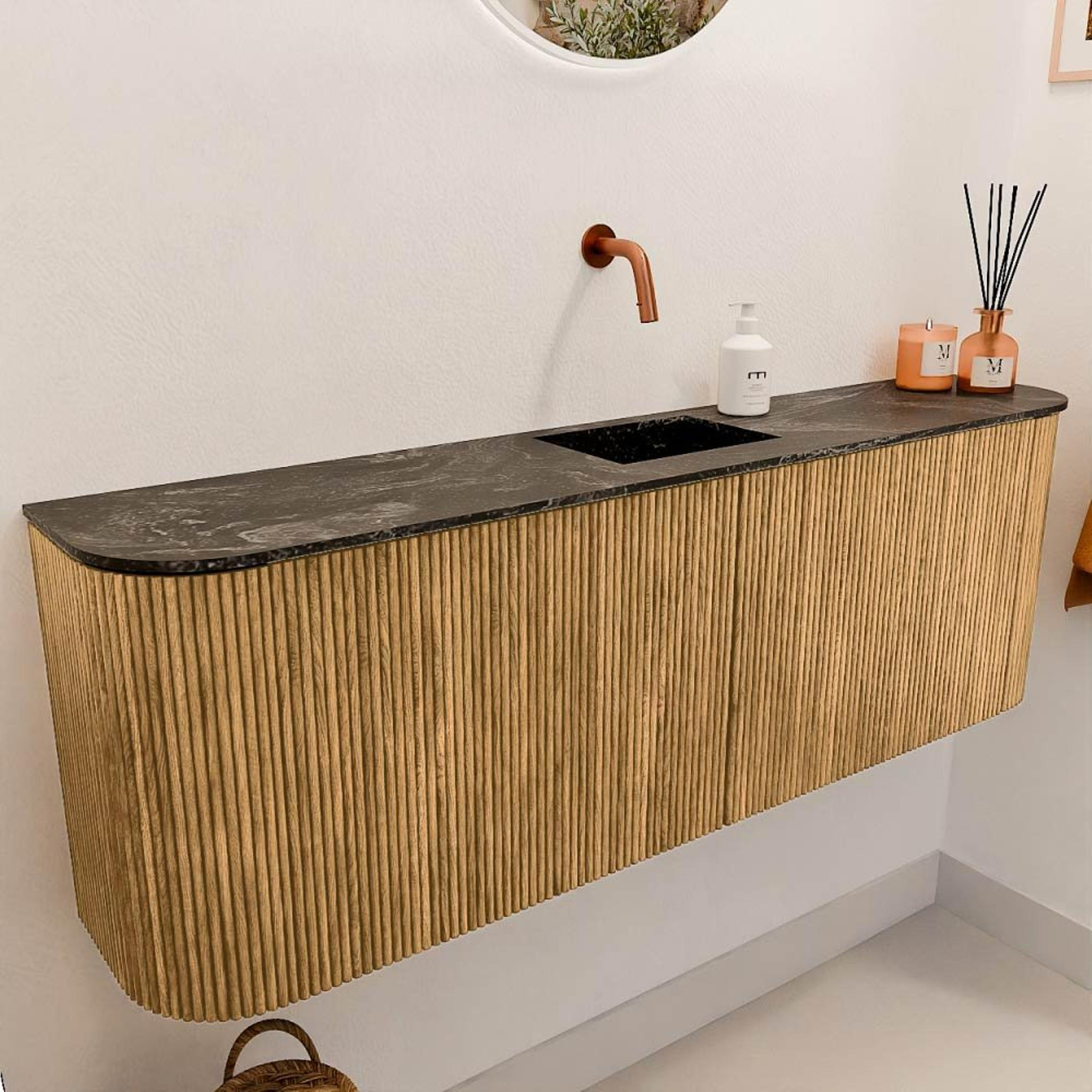 Deze elegante en praktische oplossing brengt direct warmte en stijl in jouw badkamer. Met zijn royale afmetingen en subtiele rondingen aan beide zijden, vormt dit meubelstuk een echte blikvanger zonder te overheersen. De combinatie van massief eikenhout aan de voorkant en eikenfineer aan de zijkanten zorgt voor een natuurlijke uitstraling die je badkamer een rustgevende en luxe sfeer geeft. De wastafel in de kleur Lava, centraal geplaatst en zonder kraangat, biedt je de vrijheid om zelf de kraan te kiezen die het beste bij jouw stijl en wensen past. Dankzij het slimme ontwerp met een diepte van slechts 24,5 cm is dit meubel ideaal voor zowel ruime als compacte badkamers. Het geheel wordt aan de wand gemonteerd, wat zorgt voor een luchtige en moderne uitstraling. Zo geniet je niet alleen van een functioneel meubel, maar ook van een stijlvolle upgrade die jouw badkamer transformeert tot een plek waar je elke dag met plezier begint en eindigt.Stijlvol
